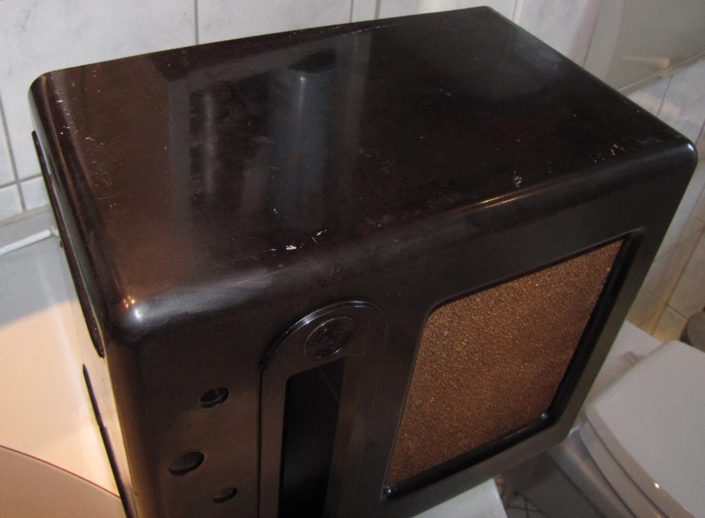 Die Gehäuserisse habe ich geklebt (Sekundenkleber-Gel), beschliffen und poliert. Die fehlende Ecke fehlt erstmal. Ich habe kein Material zum Flicken und wie schon geschrieben auch wenig Selbstvertrauen, das Gehäuse wirklich zu verbessern. Schlimmstenfalls bleibt es so. Es ist auch mit der Fehlstelle ein Stück lebendiger Technikgeschichte. Im Sockel der AF7 steckte wohl mal ein Kurzwellenzusatz, weswegen das Loch in der Rückwand verblieben ist. Leider habe ich den Zusatz nicht. Hätte ich gern mal ausprobiert.