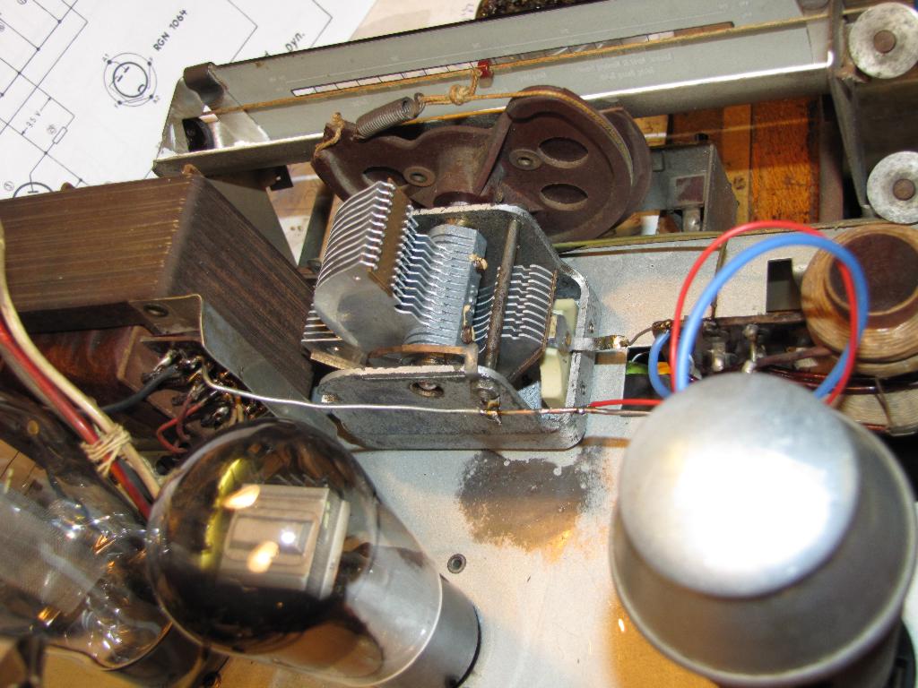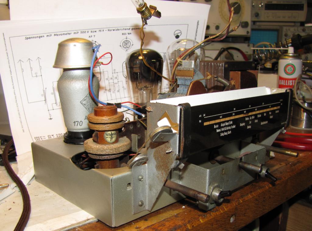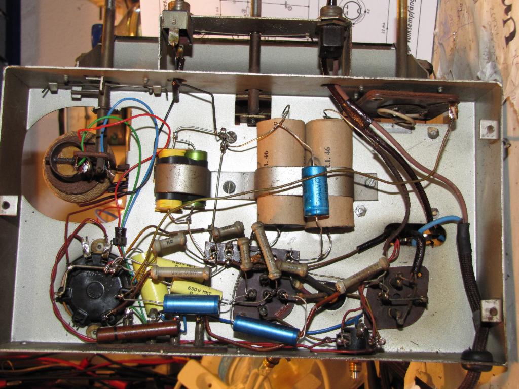 nun funktioniert mein Chassis erstmal. Als Ausgangstrafo habe ich momentan einen für die EL95 optimierten genutzt, der offensichtlich das genau gleiche Übersetzungsverhältnis hat wie das Original und der zufällig genau die gleichen mechanischen Abmessungen (Schraubenabstand) besitzt. Ich habe die vorhandenen 8µF Elkos aus den 50-er Jahren gegen 4µF Typen (regeneriert in Originalgehäuse mit Originaldruck) aus der E-Bucht getauscht. Dann habe ich den Mehrfachkondensator ausgewechselt (0,2µF / 0,1µF / 0,1µF), da mindestens der 0,2µF nur noch knapp 20nF hatte. Jetzt sind erstmal neue drin, den alten hebe ich auf (ist ggf. neu befüllbar). Den Koppel-C von der Anode der AF7 zum Gitter der Endröhre hatte ich zunächst belassen. Er war statisch (bei 3V) hochohmig und seine Kapazität war mit 13nF (statt 10nF) auch ok. Dann steckte ich nur die Gleichrichterröhre. Es waren 450V Anodenspannung im Leerlauf vorhanden und am Gitter der (nicht gesteckten) Endröhre lagen +95V an. Also war auch der Koppelkondensator fällig. Im Betrieb soll zwar an der Anode der AF7 nur 17V ... 33V sein, aber beim Hochheizen könnte ja die Anodenspannung vor dem Strom der AF7 oben sein und dann hätte das Gitter der Endröhre hohes positives Potential. Nach dem Wechsel des Kondensators war die Spannung am Endröhrengitter negativ, also durfte nun die Endröhre rein. Es brummte im Lautsprecher und wenn der Anodenanschluss der (nicht gesteckten) AF7 berührt wurde, brummte es lauter. Nun kam die AF7 hinein und das Gerät konnte mit einem einige Meter langen Kabel im Keller einige Mittelwellensender (DLF, 2 x russ. 1 x frz.) sowie einen Langwellensender empfangen. Das Brummen war mir jedoch zu stark und ich baute einen zusätzlichen Elko von 4µF vom Pluspol des Ladeelkos zur Masse des Gerätes ein. Das verringert das Brummen erheblich. Es ist zwar nun modifiziert, aber auf eine Art, die auch zur Hauptnutzungszeit hätte gemacht sein können (hätte ich bestimmt so gemacht!). Nun konnte auch mit dem nachgerüsteten Entbrummregler (50 Ohm genau passendes Drahtpoti, das ich gerade da hatte - als Ersatz für die beiden in diesem Gerät bestückten 25 Ohm Widerstände) auf Brummminimum abgeglichen werden.