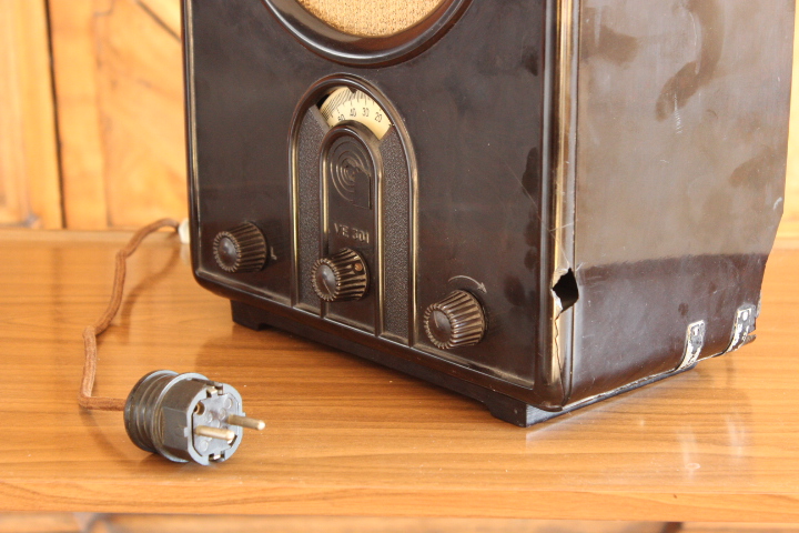 Die Beschädigungen am Gehäuse sind unübersehbar, aber der VE funktioniert. Das Radio wurde von der Frontansicht immer weiter nach rechts gedreht.
