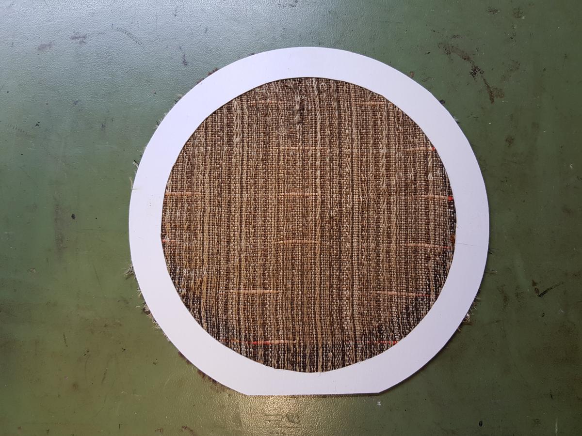 Die letzte Baustelle war dann noch die Lautsprecherabdeckung. Der originale Stoff lag glücklicherweise noch im Gehäuse drin, also habe ich mich noch dran gemacht, den "neuen" Stoff wieder zu ersetzten. Da der originale Stoff recht knapp ist, habe ich ihn erst auf einen Ring aus Pappe geklebt, um ihn zu spannen und in Form zu bringen. Den Ring sieht man später nicht mehr, da der Lautsprecher davor ist. Schöner wäre es natürlich ohne Pappring gewesen, aber ich hatte etwas Bedenken, ds kleine Stoffstück im Gehäuse gerade reinzufummeln.
