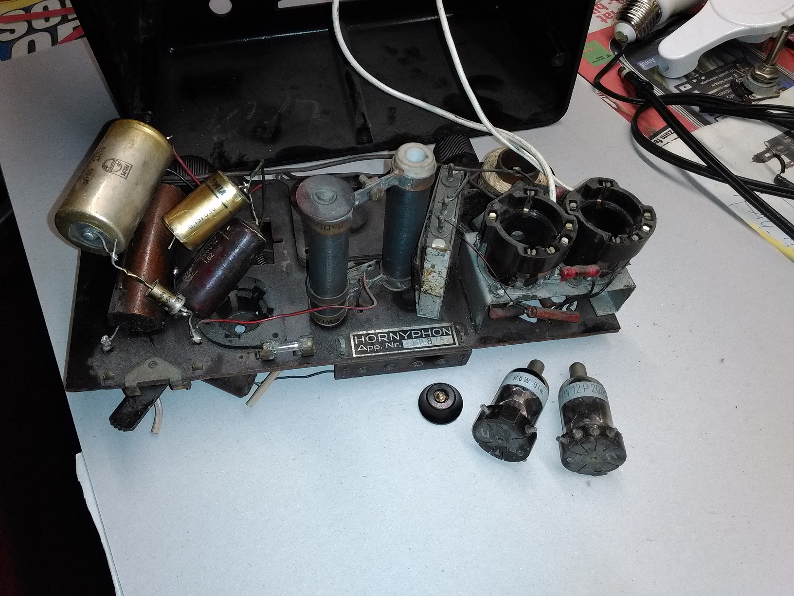 Damit ihr mich nicht allzusehr für einen Banausen haltet, verspreche ich feierlich, daß ich das alte Chassis möglichst original aufarbeiten werde, womit ich dann Ersatz für den "edlen DKE38" habe, und ich werde das halten, sowahr ich kein Politiker bin.