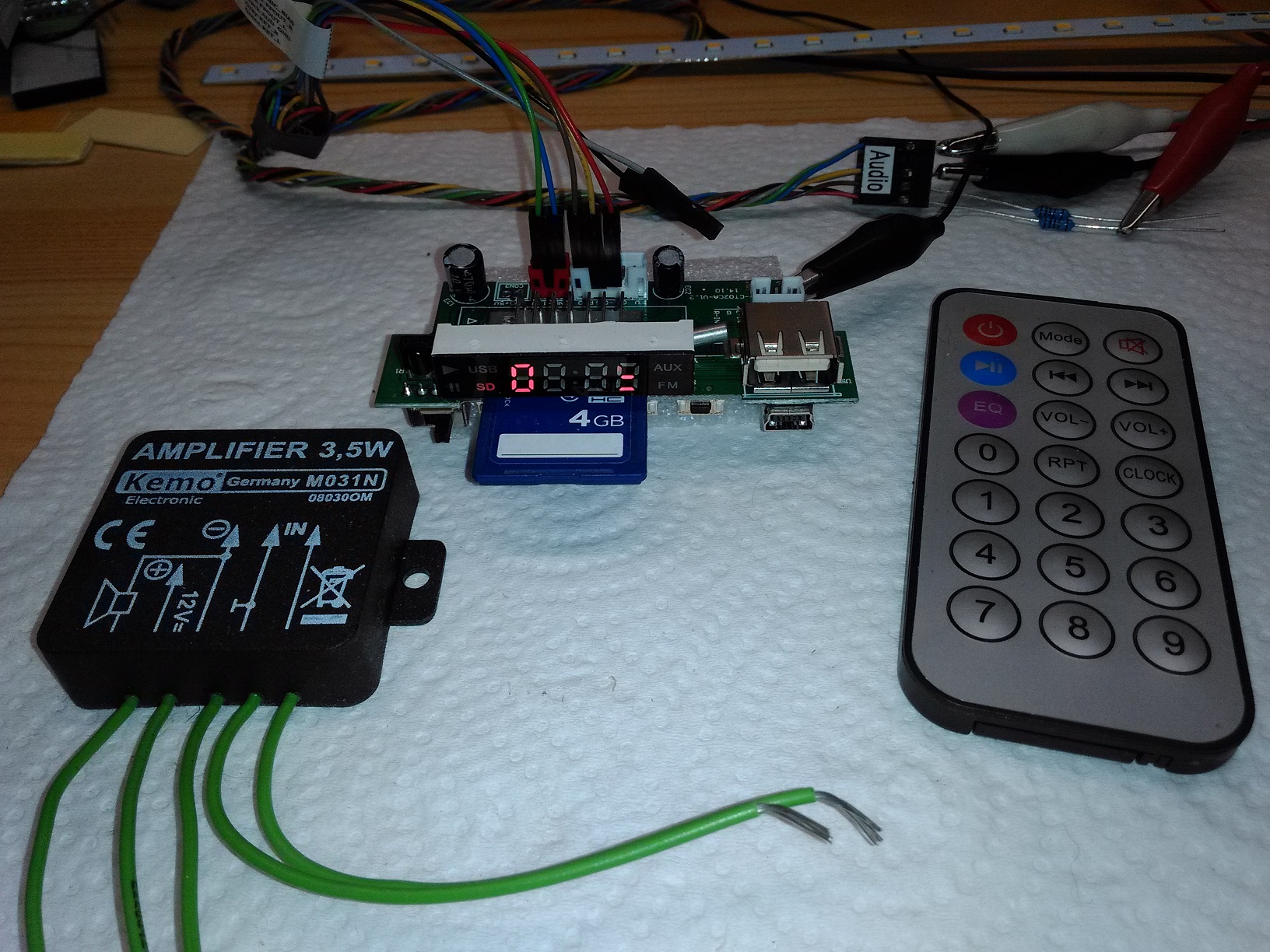 den Oldtimer-Original-Puristen unter euch wird wenig gefallen, was ich zu berichten habe: Ich konnte recht günstig einen total vermurksten DKE38 mit einem schadensfreien Gehäuse erstehen (Bild 1 bis 4). Einen zweiten, mit viel Aufwand original restaurierten DKE38, der ordentlich funktioniert, muß ich allerdings nicht haben, und ich habe daher die alte Kiste zu einem mp3-Player mit FM-Radio für meine Sauna umgebaut. Den mp3-Playerbaustein gibt es für unter 5,- € im online-Handel, einschließlich Porto! Der fertige NF-Verstärker und ein Printrafo kommt ebenfalls von da. Seht euch Bild 5 an. Das teuerste Einzelteil am Projekt war das Gehäuse, obwohl ich die Kiste halbwegs preiswert erstehen konnte.