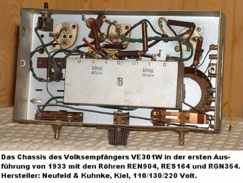 Guten Tag! Als zufälliger Neubesitzer eines VE 301W von AEG habe ich nach einem Forum gesucht und habe es in HOCHWERTIGER Form bei Euch gefunden. Das Gerät habe ich nun erst eine Woche und doch ist bei mir ein Fieber Ausgebrochen... das Ding muss wieder spielen. Der Zustand: -Gehäuse kleiner Riss 2-3cm an der Bodenseite hinten, mit Sekundenkleber von innen kein Problem -der Kondensatoblock fehlt, die Lötösenleiste ist vorhanden, Conrads rote Blockkondensatoren sind bereits unterhalb der Lötösen von mir neu angebracht, Becher Masse ??? herstellen oder??? -Skalenscheibe mit Heissluft und Kaffeetasse gerichtet -alle Röhren in Watte weggelegt, hoffentlich tun sie es noch, Strom hben sie bei mir keinen bekommen , es scheinen die Richtigen R.. zu sein, vor Aufregung noch nicht genau geprüft -originaler LS Stoff gereinigt und straff eingeklebt=hat nicht viel an Sauberkeit gebracht!!! -Chassis gereinigt, Note 2-3 im Zustand -Drehko, keine optischen Schäden aber kurz vor dem Eindrehen schabt etwas - HAT HIERFÜR VORAB JAMAND EINEN TIPP ?????? AUSBAUEN / Zerlegen ODER ????? -der Entbrummer ist / sitzt am Netztrafo, ist das RICHTIG??? -Lautsprecher 1,9kOhm knackt beim Prüfen, sieht gut aus -orig. Netzkabel mit falschem Stecker, noch ungeprüft, Eure Erfahrungen ... ist es Durchschlagfest oder Austauschstoffkabel einsetzen ??? - alte Röhrchenkondensatoren werde ich versuchen mit neuem Inhalt zu füllen.. besondere Hinweise von Euch dafür ??? - hat schon jemand die NF von außen zugeführt, wie gemacht und wo, ich würde mir gern eine CD brennen mit passender Musik aus den Jahren, hierfür suche ich noch die Senderkennung der BBC mit den Pauken als MP3, kann mir hier BITTE jemand heeeelfen???? - Gehäuse gereinigt aber noch nicht poliert -Sicherung Original, beschriftet ohne Wert a b e r VE301 kurz und gut das ist meine erste Restauration und nur durch EUER SCHREIBEN hier im Forum ist Euer Feuer auf mich übergesprungen! Danke für die vielen Tipps, Anleitungen, Bilder, WARNHINWEISE ..... Viele Grüsse q12