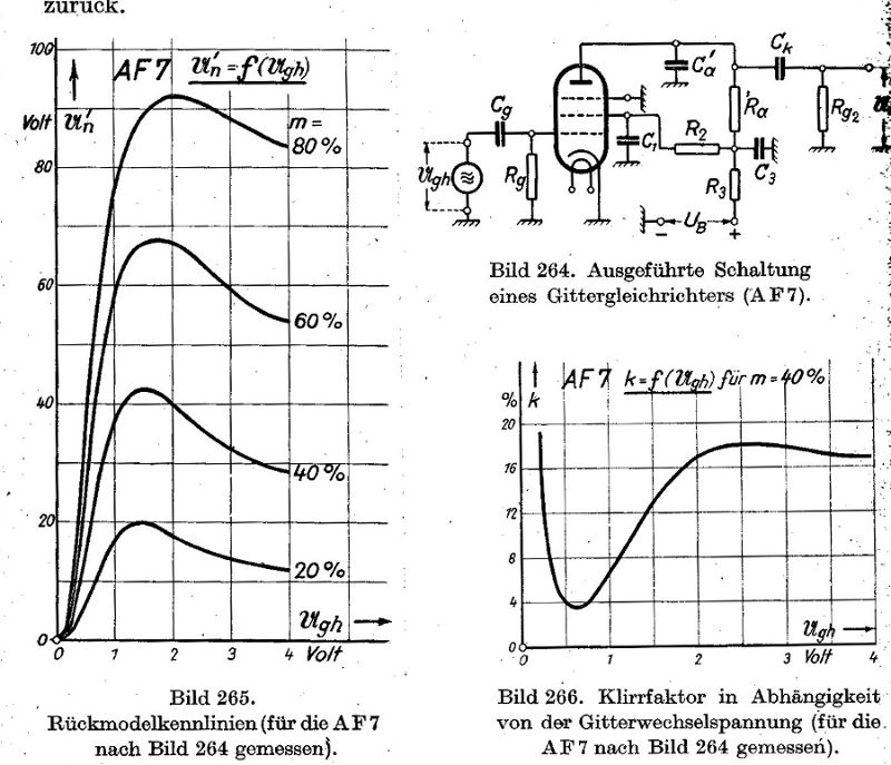 Es ist in der Tat so das es einen Zusammenhang von Modulatonsgrad, Gitterwechelspannung, Klirrfaktor usw. gibt. Für alle VE Fans habe ich die folgenden Grafiken gefunden, speziell zur AF7. Es gibt auch genaue Berechnungen der Klirrfaktoren der verschiedenen HF Gleichrichter, hier ist es der Gittergleichrichter das Audion. Es ist keine spezielle VE Schaltung, sondern eine Messanordnung die die Zusammenhänge verdeutlicht.