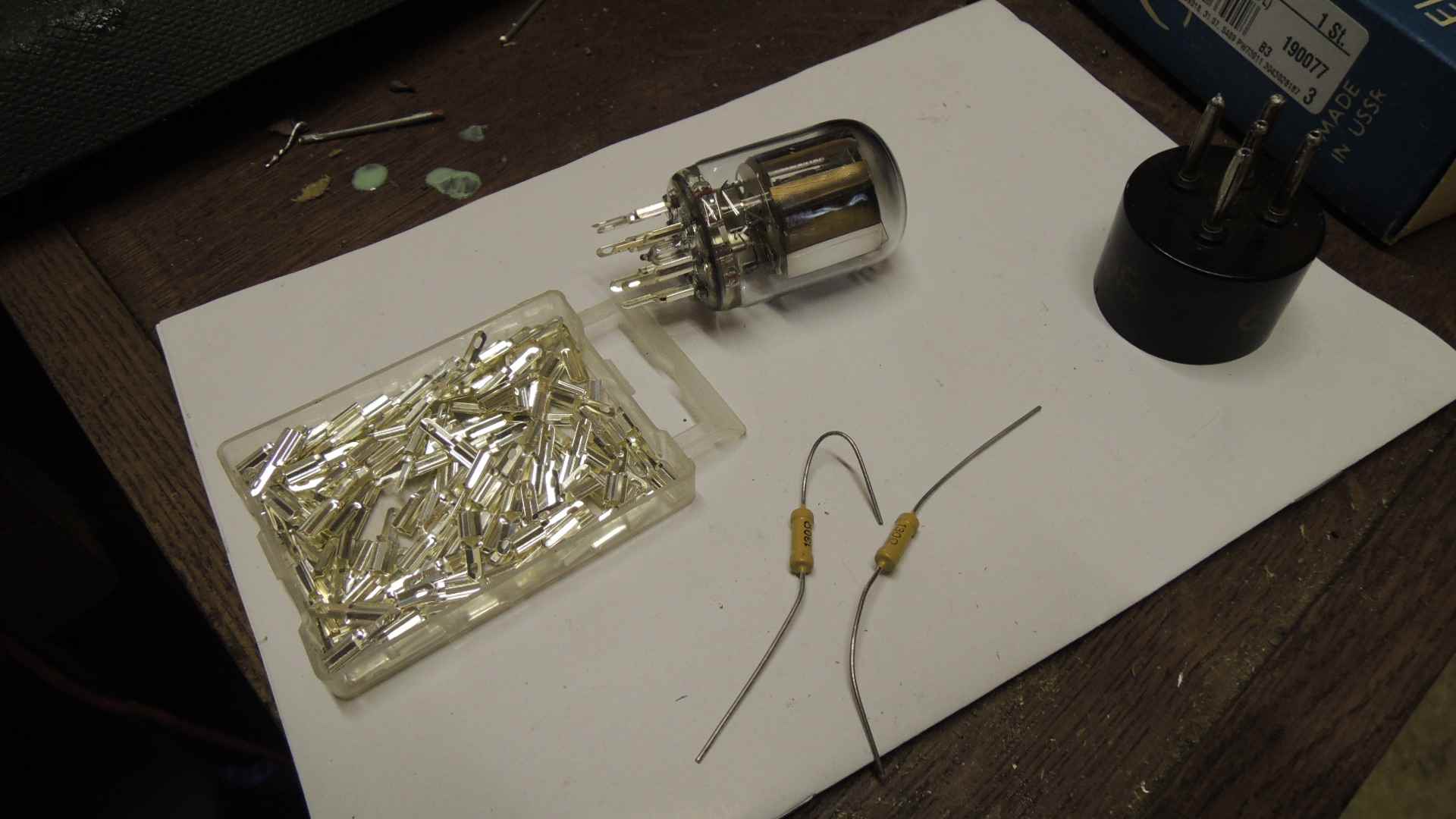 Zur Information hier mal ein Bild, wie ich die Russenröhren anschließe. Die Fassungen sind mir zu sperrig. Daher nehme ich die kleinen Steckkontakte, die man direkt auf die Röhrenpins schieben kann.Nur seht nicht auf die Röhre, ich habe für mich eine RE 134 gezaubert.