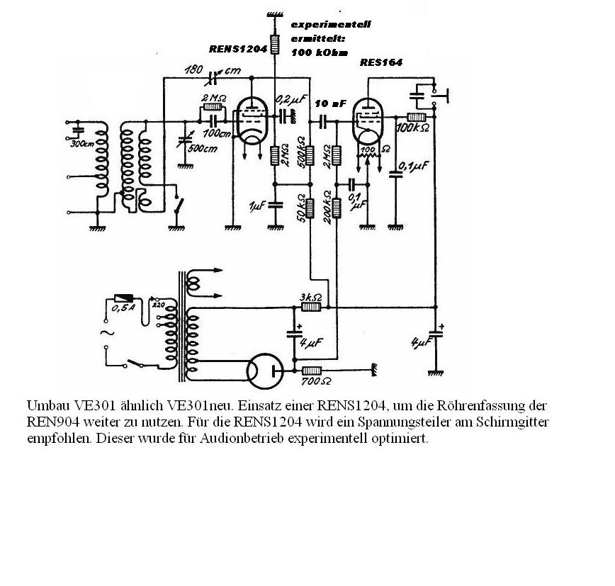 es könnte ja sein, daß ich mal zu akzeptablen Bedingungen einen Ersatztrafo bekomme. Jedenfalls für 60 € eine Spule Draht zu kaufen, um den Übertrager neu zu wickeln, scheint mir auch nicht angemessen. Das hätte bestimmt auch keine Werkstatt ihren Kunden angeboten. Deshalb erschien mir die Lösung mit der alten Schirmgitterröhre als die gringste Änderung in Bezug auf einen späteren Rückbau und die Erhaltung der Funktion. Mir war wichtig, daß die Fassung bleibt und wenig Änderung an der Schaltung und am mechanischen Umbau. Ich denke auch, daß das VE-Flair mit der RENS1204 ganz gut gewahrt wird. Da ich meine Geräte auch gerne mal tönen lasse, mit Musik aus dieser Zeit, benutze ich in diesem Falle die russischen Ersatzröhren, um die Originalröhren zu schonen. Mir gehts also nicht um Leistungssteigerung. Ich habe den Effekt nur mal mit erwähnt. Ist ja auch interessant, was mit moderneren Röhren aus den alten Geräten noch herauskommt, auch mit welchen unerwarteten Tücken man dann konfrontiert wird. Rainer-Wumpus hat ja schon mal vorsichtig angefragt, wie sich die Rückkopplung dabei verhält .... Also keine Bange, der Originalzustand ist mir auch wichtig. Es wird kein Retro-Dummy.