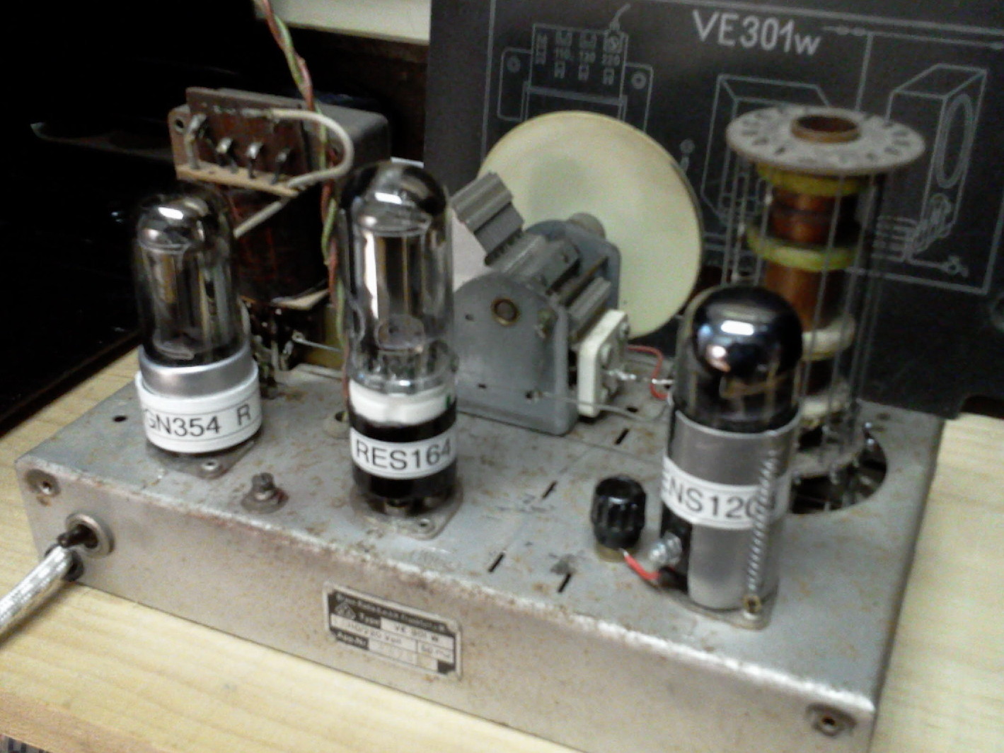 wie hätte eine Dampfradio-Werkstatt einen VE301W repariert, wenn der NF-Übertrager defekt und nicht beschaffbar wäre ? Trafo neu wickeln ? Wollte ich auch zuerst, aber es widerstrebte mir aus mehreren Gründen. Auch hatte ich mal gelesen, daß eine verbesserte Version des VE301 mit einer Pentode anstatt mit der REN904 entwickelt wurde. Also: Umbau auf eine Pentode, und zwar eine, die in die Fassung der REN904 paßt, mit der Option auf Rückbau, falls mir mal ein Ersatzübertrager zufliegen würde.