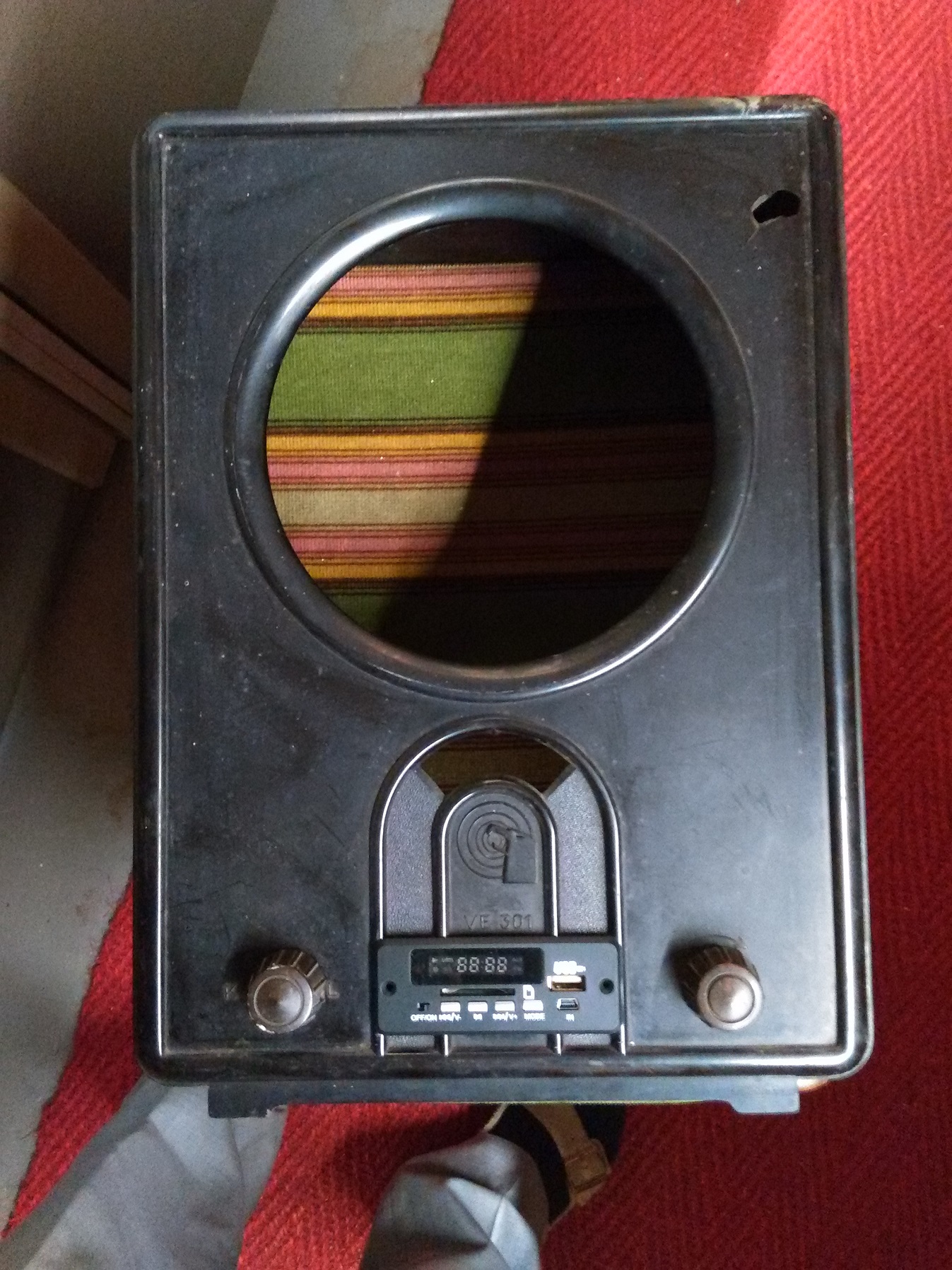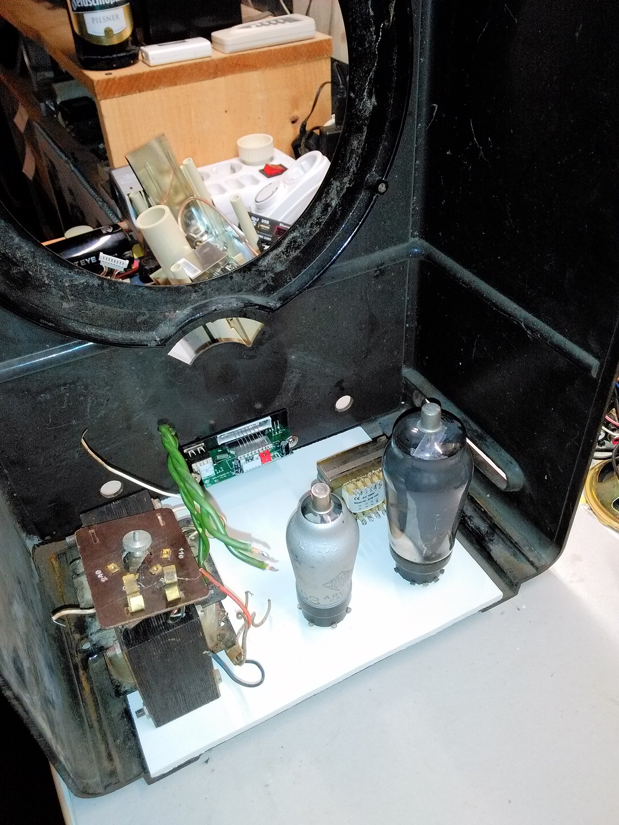 Hallo,guten Abend.Habe in meiner Lehrzeit auch einen Volksempänger bekommen können.Der stand dann immer irgendwo herum.Da er kein FM hatte wo man meine Musik in guter Qualität spielte kam ich irgendwann auf die glorreiche Idee das Chasis auszubauen und einen billigen Transistorverstärker einzubauen um den Cass.Recorder daran anzuschliessen.Gesagt ,getan mit dem Originallautsprecher leider kein berauschender Klang.Wieder in die Ecke gestellt,und irgend wann dann an einen Kumpel billig verscherbelt.Über meine damalige Dummheit ärgere ich mich bis heute!.Ich würde in der Situation das Gehäuse optisch bis auf das Einschussloch herrichten und einen kleinen MP3 Player mit Radio, Lautsprecher und Bluetooth die es für ein paar Euro gibt an der Rückwand montieren.Somit hätte man dann Originalgerät und auch moderne Soundmöglichkeiten.