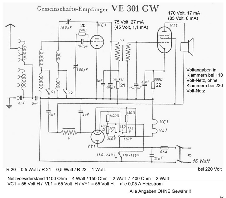 ... an der Röhrenfassung der VC1 --> VF7 brauchen nur Schirmgitter und Bremsgitter mit den wenigen Bauteilen angeschlossen werden (siehe Schaltbild) und die VC1 gegen eine VF7 getauscht werden.