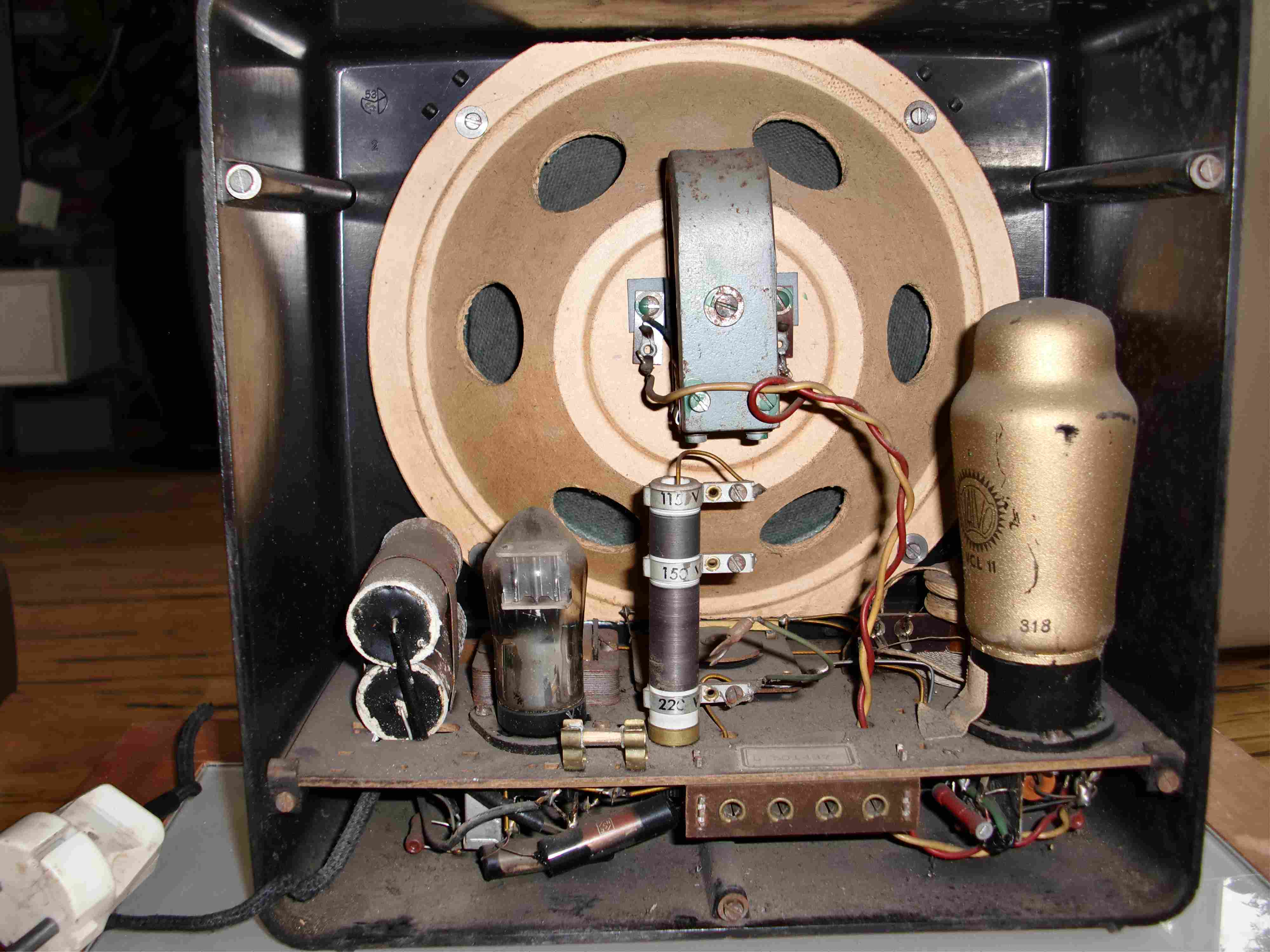 der Gehäusfront nach zu urteilen kann es sich nur um ein Gerät aus der Nachkriegsproduktion handeln. Indiz: Das Emblem aus Reichsadler und XXX-Kreuz ist durch eine Schallwellen-Symbolik ersetzt worden. Auch die Rückwand deutet darauf hin. Das Vorkriegsgerät trug dort die Bezeichnung "Deutscher Kleinempfänger 1938".