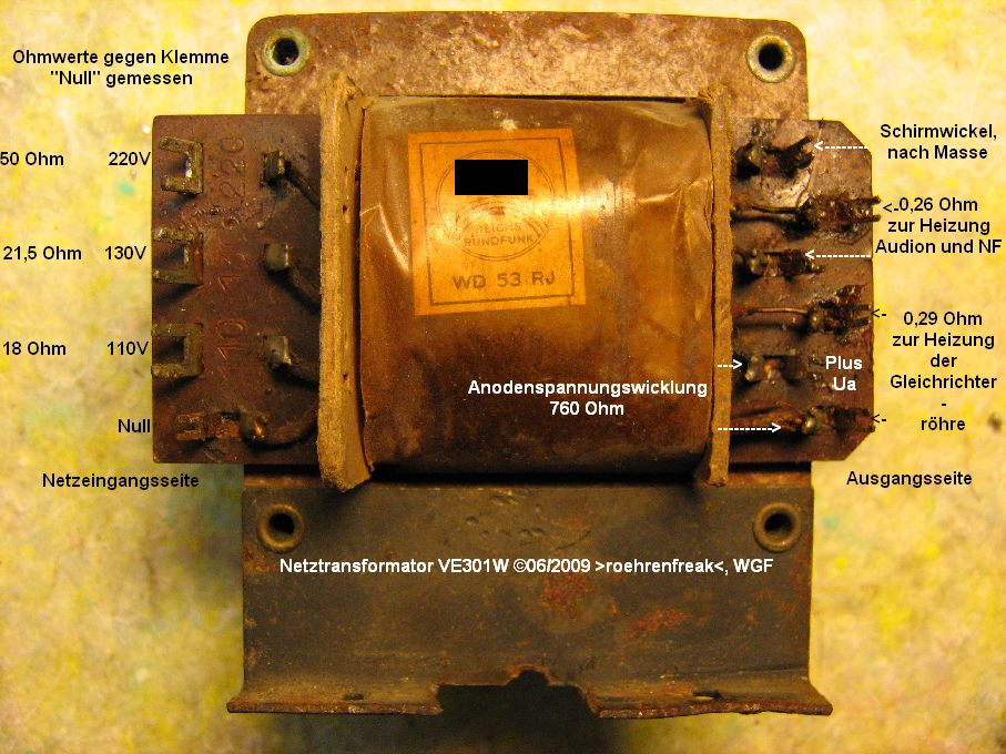 Hier wird der Netztransformator des VE301W im Detail gezeigt. Die Ohm-Messwerte wurden mit einer Wheatstone-Messbrücke "Pontavi Wh2" von Hartmann und Braun bei einer Raumtemperatur von 20°C gemessen. Es sind Abweichungen von ein paar Prozent bei anderen Temperaturen möglich und unbedenklich. Im unbelasteten Zustand darf sich der Trafo bei 220V~ Eingangsspannung nicht merklich erwärmen und soll folgende Ausgangsspannungen liefern: