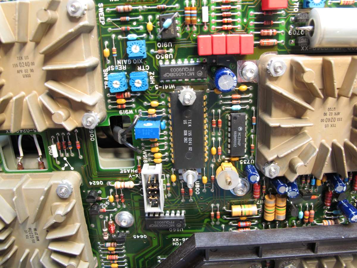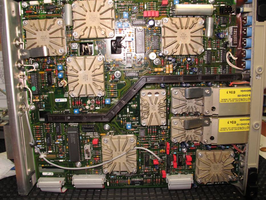 hier mal ein Mainboard Bild des 2465B (400MHz) aus 1988/89: Hier gut zu sehen die fetten TEK IC's. Ohje, ohje wenn da mal einer defekt geht. Auch ein wahrhaft heisses Teil ist der Horizontal-Endstufen IC U800. Ungefähr zu sehen da, wo die Platine hellgeblitzt ist. Der ist wenn der defekt geht nicht mehr neu zu bekommen! Empfindlich bei dem Scope ist auch die Umschaltung auf die 2'te TB durch ziehen des TB Knopfes. Wenn da oft mit zuviel Kraft gezogen wird, geht die Kupplung kaputt.