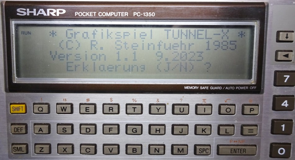 Man muss zuvor sagen, dass es für diese Taschen-Computer wenig Spiele gab, die Käufergruppe hatte eher andere Interessen. Nicht aber ich: Da das Gerät tatsächlich für das Display einen Grafik-Modus hatte, konnte ich mich an das Schreiben eines Grafik-Spiels heranwagen. Und siehe dar, es ist mir gelungen: Tunnel-X heisst das Programmchen, was die Grafik-Optionen ausnutzt und ganz witzig ist, will sagen es macht Spass es zu spielen, obwohl es nicht ganz einfach ist.