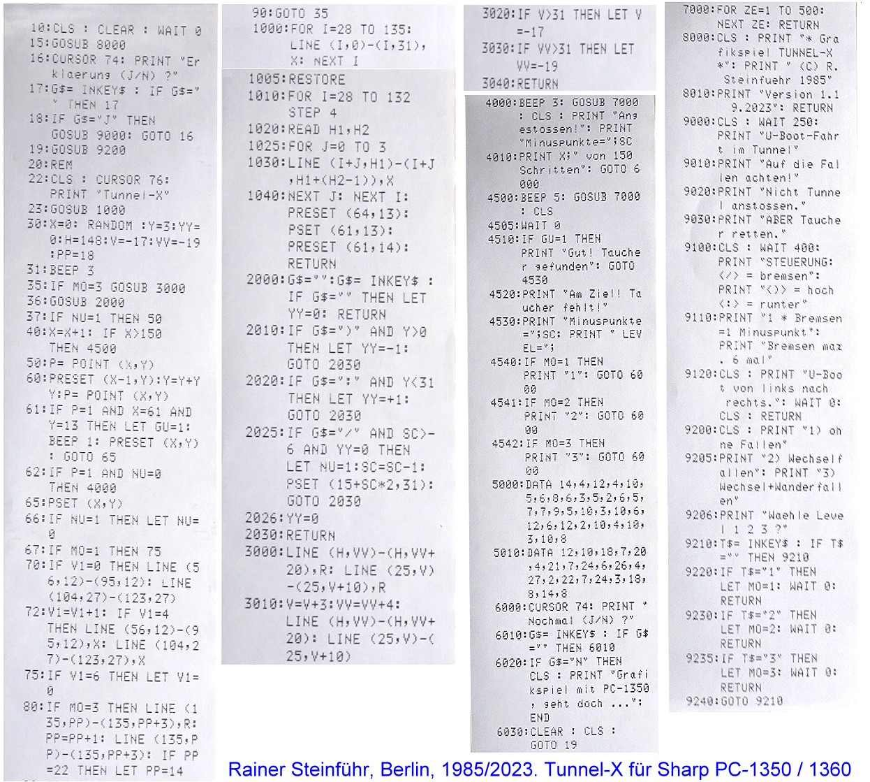 Hier das Programm-Listing für das Computerspiel "Tunnel-X" für Pocket-Computer Sharp PC-1350 / 1360: