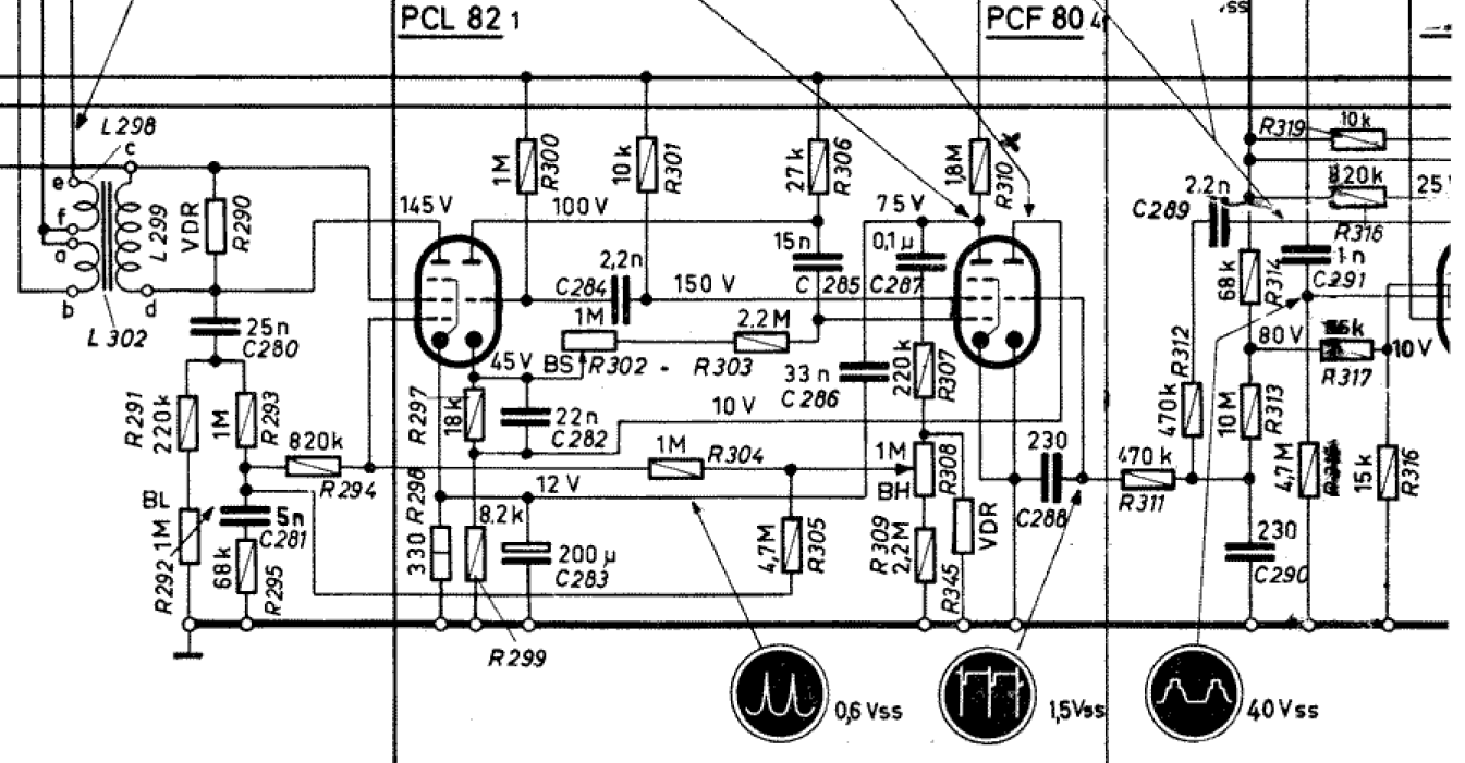 Das einzige was gravierend aufgefallen ist, dass die Spannung an der Röhre PCF80 2 Triode an Pin 8 Katode NICHT wie im Plan einstellbar ist. ( Plan 95 - 150V ) Das ist auch das Signal für die Katode der Bildröhre. Messung: Kontrast min: 168 V Kontrast max: 133 V