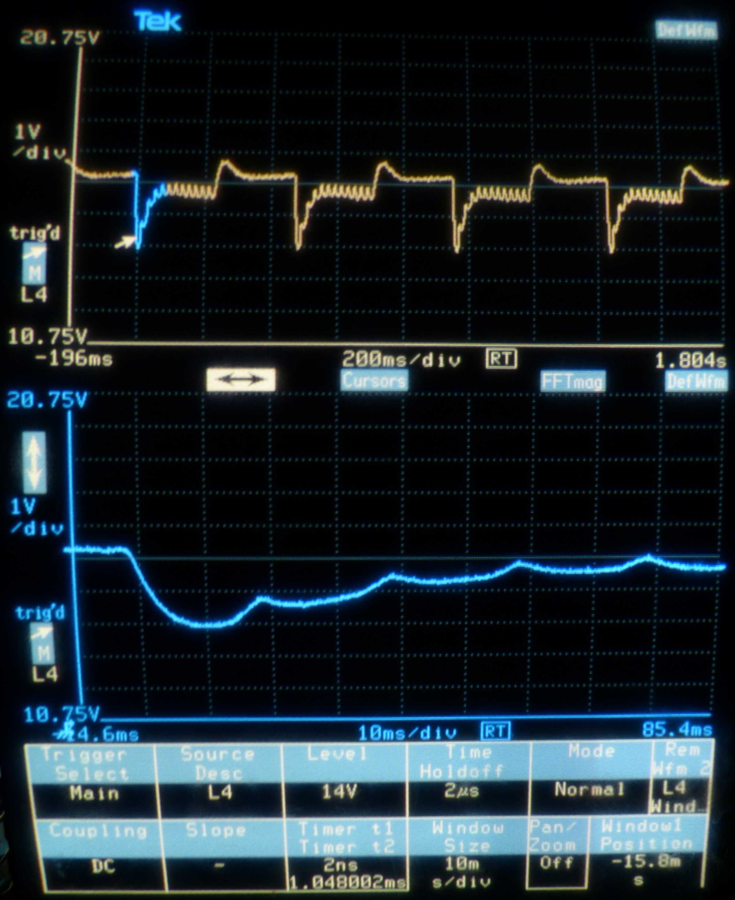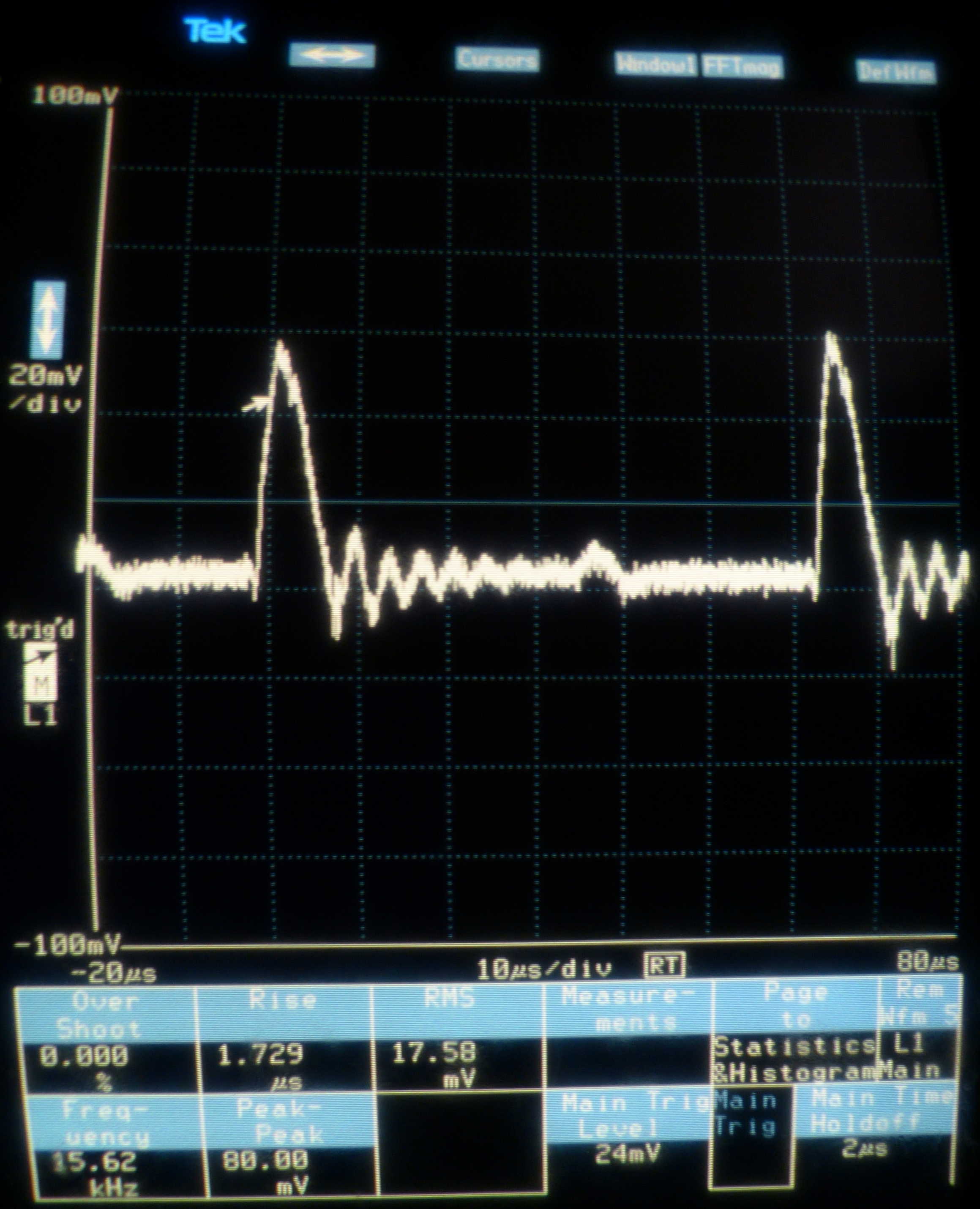 Eigenartigerweise bricht die Spannung beim ersten Hell-Bild stark zusammen um sich dann in den folgenden Bildrücklaufen, aber auch während des Bildaufbaus, wieder zu erholen. Wenn das Dunkel-Bild kommt gibt es einen deutlichen Überschwinger.