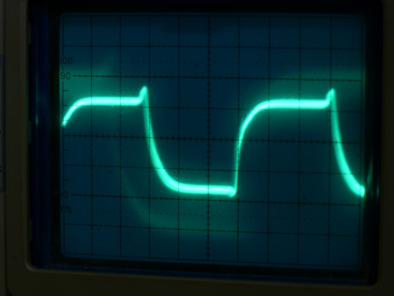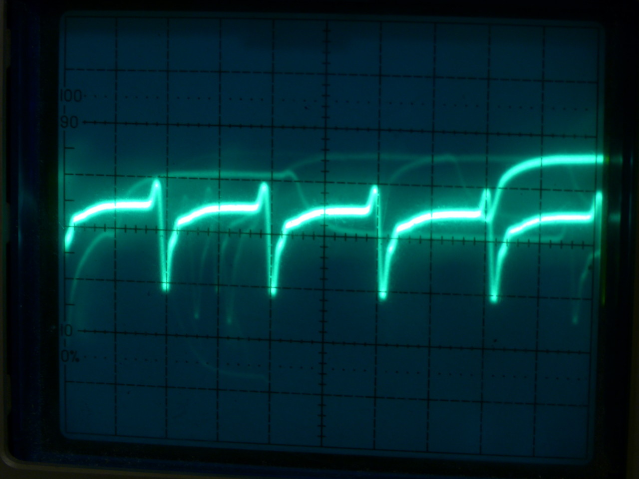 Nachem ich diese Kurve recht ordentlich einstellen konnte war ich von dem Ergebnis auf der Mattscheibe jedoch enttäuscht. Insbesondere hatte ich deutliche Schlieren bei den abrupten Übergängen. Daher musste ich nun nachregeln, damit das Bild auch subjektiv gut aussieht. Ich mache das mit Unterstützung durch ein Oszilloskop das mir die Kurvenform des Videosignals anzeigt. Siehe die beiden ersten Bilder und die dazugehörigen Screenshots.