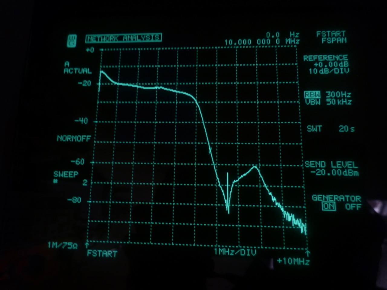 Nachdem ich mit dem Bild einigermassen zufrieden war habe ich mir nochmal angeschaut was der SNA dazu sagt (siehe letztes Bild). Die Kurve zeigte eine Überhöhung bei tiefen Video-Frequenzen, eine kontinuierliche Abnahme hin zu hohen Frequenzen und eine Bandbreite von über 5MHz (normalerweise sollten es 4,5MHz sein). Die Einkerbung durch die Tonfalle bei 6,5MHz ist ebenfalls gut zu sehen. Der Strich an der Stelle des Tonträger ist möglicherweise ein Übersprechen aus dem Tonzweig.