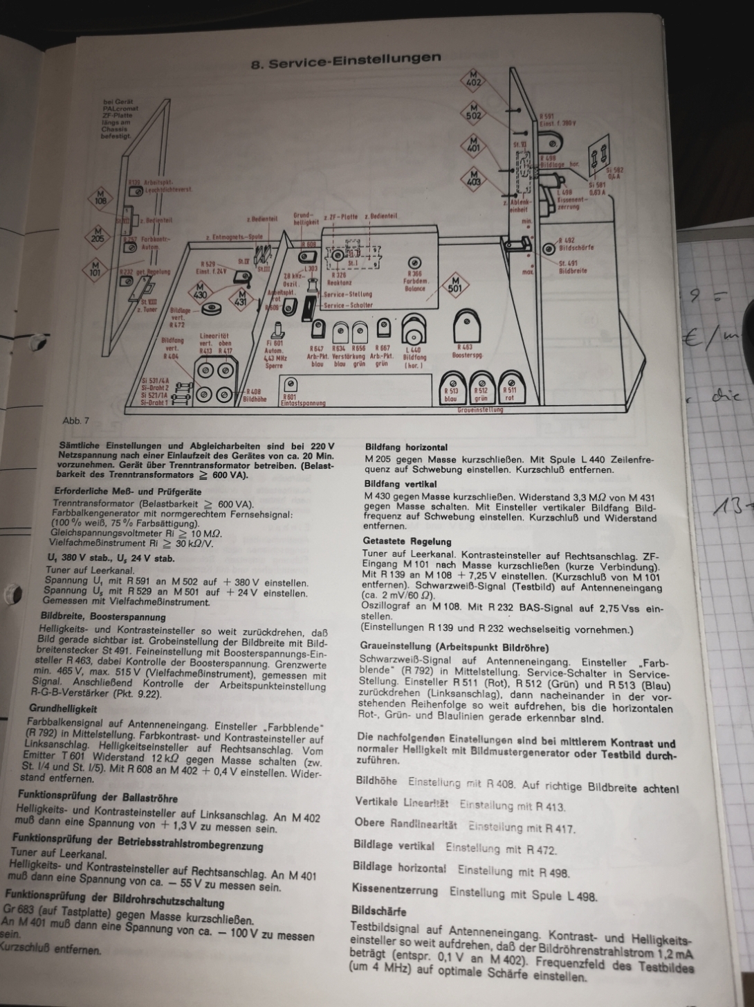 Wenn man weiss, was man tut, kann man die Fokussierspannung wie folgt messen (Achtung!!! Mehrere Kilovolt! Lebensgefahr!: - Bei abgeschaltetem Gerät Fokussierelektrode nach Masse kurzschliessen (z.B. Fu500 überbrücken), so werden gefährliche Spannungen abgeleitet. - Hochspannungsteiler mit 10*10M-Widerständen in Serie (1000V-Typen, 'Freiluftverdrahtung', damit keine Kriechströme) an die Fokussier-Elektrode der Bildröhre, anderes Ende über 1M nach Masse, Multimeter (Röhrenvoltmeter oder DVM) parallel zum 1M-Widerstand. - Kurzschluss wieder entfernen, Messgerät richtig einstellen (misst 1/100 der Fokussierspannung) und danach Gerät einschalten. - Messaufbau erst entfernen, wenn nach Ausschalten des Geräts keine Spannung mehr angezeigt wird!