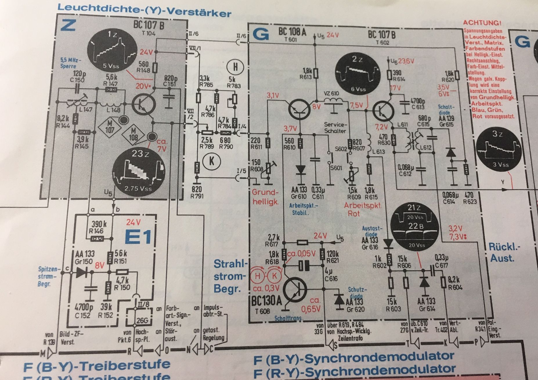 Schaltbildversion: Hast du als Schaltbild nur ein einzelnes Blatt oder die Service-Druckschrift? Letzteres liegt mir in der Version FS67-4708a (1968) vor. Dort ist das was bei dir unter "E1 Zusatzplatine" zu sehen ist, bei mir integriert mit dem oben zu sehenden Teil Z Leuchtdichte (Y) Verstärker. Wahrscheinlich hast du die erste schaltbild-Version FS 67-4708 (1967).