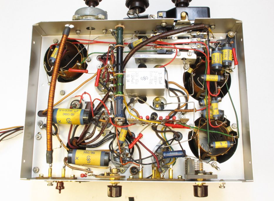 Auf dem Bild sind die beiden Vertkalröhren oben rechts unter den beiden metallenen Elkos versteckt. Diese Elkos konnte ich aber in den Unterlagen nirgends finden. Bis ich herausfand dass die letztlich parallel zu je einem tauben Becherelko hängen. Wobei statt 100uF/100V einfach mal 50uF/35V verbaut wurden...