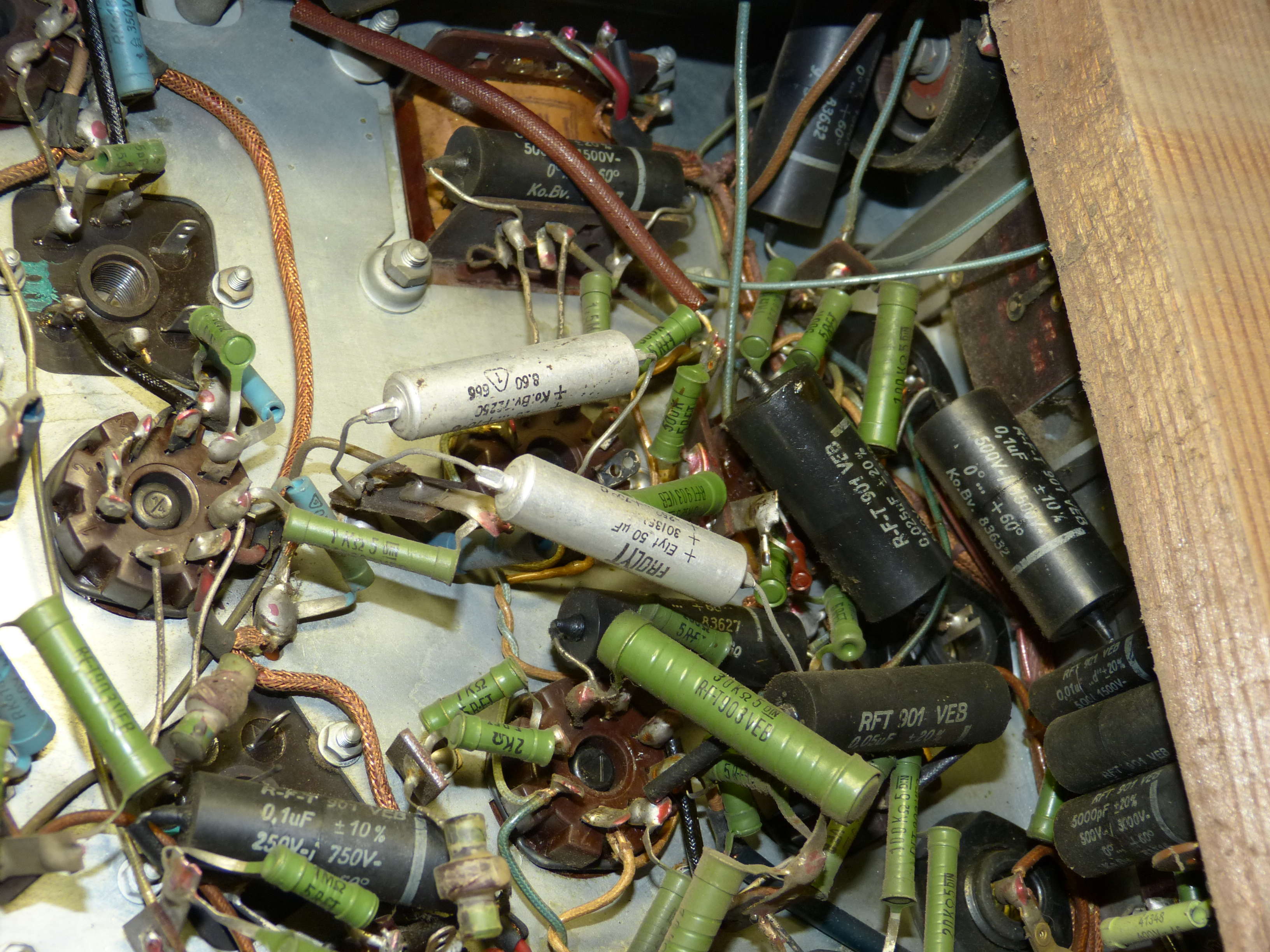 Hier habe ich dir mal ein Bild eines restaurierten SABA Chassis von 1934. Das Chassis wurde komplett zerlegt und neu aufgebaut. Das ist nicht kompliziert, weil der "nur" ein Dreikreiser ist. Dieses SABA hat Wickelkondensatoren von Siemens in Glasröhrchen, die ich auch neu befüllt habe. Ich glaube später kann ein jüngerer Erwerber nicht mehr erkennen ob das original war oder nicht.