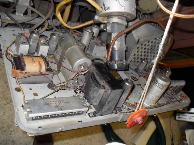 Dieser Trafo auf der Chassis innenseite ist mal ersetzt worden,man sieht es an den Lötstellen und geflickten Drähten. Erinnert mich irgendwie an Philips,die waren auch oft so schwarz,fast wie mit Teer überzogen.... [img][/img]
