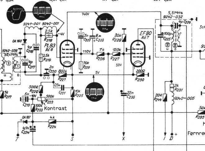 Ich habe sporadisch Widerstände um die PL83 gemessen und keine Fehler gefunden. Die Oszilogramme sehen jetzt ganz gut aus. Die Spannungen (SS) kommen annähernd hin. Vor dem Kondensatortausch war die absolute Höhe des Synchronimpulses fast genauso hoch, wie die des Bildsignales. Nach dem Tausch ist das Verhältnis so etwa wie es sein soll.