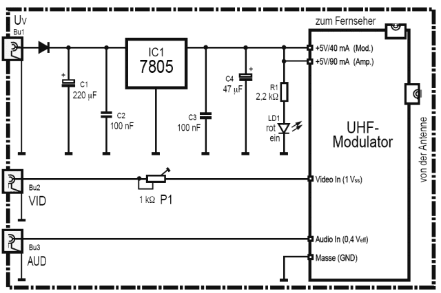 Wenn ein externer Videorecorder/DVD-Spieler an den Modulator angeschlossen wird, halte ich den von Florian eingesetzte 75 Ohm - Widerstand für besser geeignet. Da der Ausgang des DVD-Spielers für den Anschluss an einen 75-Ohm-Eingang vorgesehen ist, vermeidet man so auch Geister aufgrund von Fehlanpassung (bei kurzen Leitungen vermutlich kaum sichtbar). Der Einstellregler könnte höchstens zusätzlich nötig sein, wenn der Pegel trotz 75 Ohm - Abschluss noch immer zu groß sein sollte.