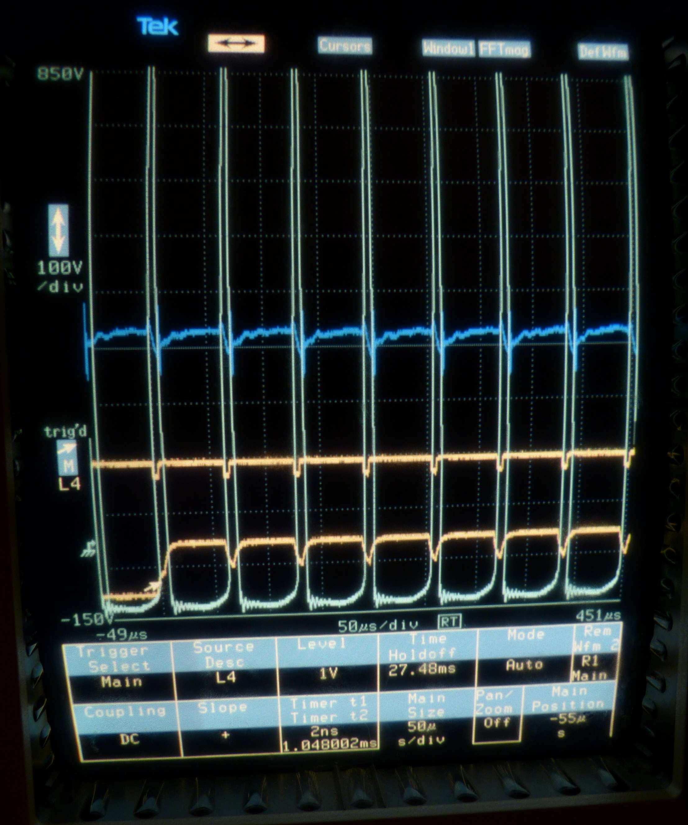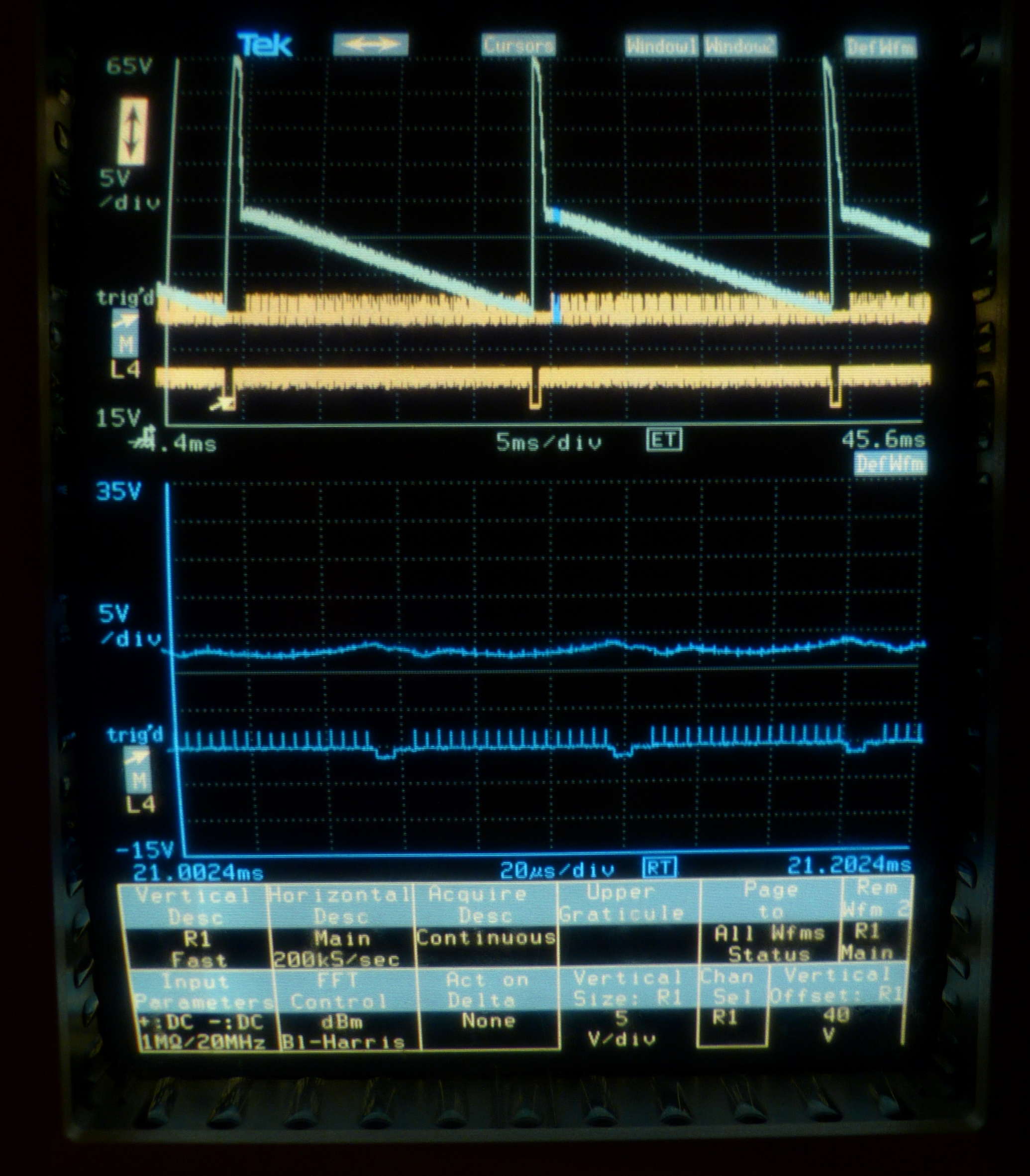 grün: horizontale Ablenkspannung an Zeilentrafo gegen Boosterkondensator (mit 2 Tastköpfen und Differentialeinschub gemessen) blau: Fokusspannung am Fokuspoti (AC mode) gelb: Videosignal gelb: Sync Signal des Videogenerators