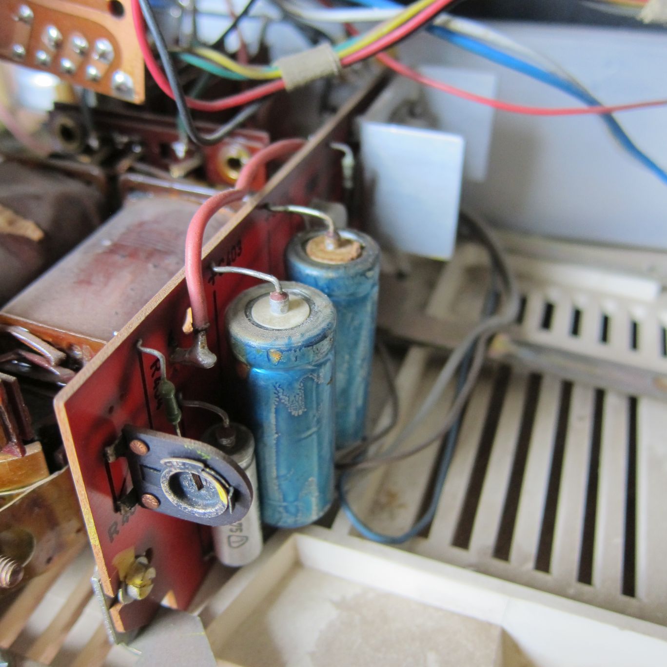 na da waren die Vermutungen wohl rel. nah dran. Also wie auch Wolle vorschlug, am besten erstmal die Kondensatorkur machen (wenn Perspektive für Zeilentrafo besteht, ist der dunkle Fleck eine Schmorstelle?)). Wobei die roten Arbeiterfahnen ("Stalins Rache") nicht so oft kaputt sind wie die Schneemänner! Die blauen DDR-Elkos auf dem Foto ersetzen, wenn da was am Gummi rausquackert (der hintere), viell. doch gleich beide. Bei den Schneemännern ist die zweite Zahl nach dem Schrägstrich die Spannung also 10/40 10µF/40V ("µ" meistens Tastenkombi "AltGr" + "m" ).