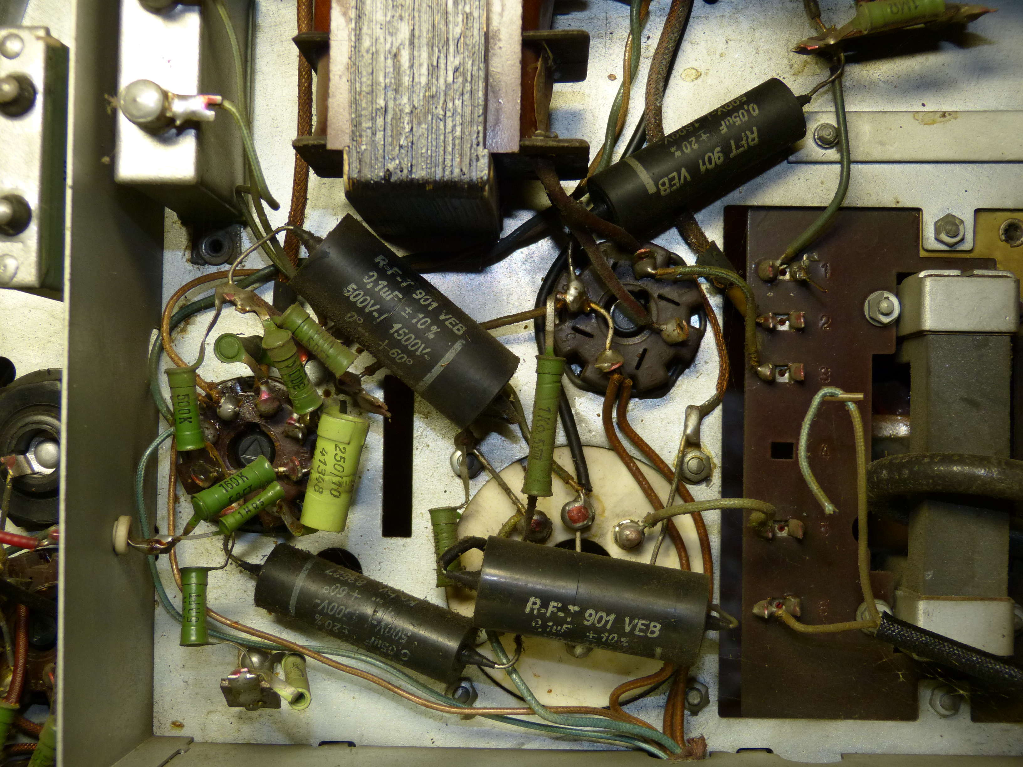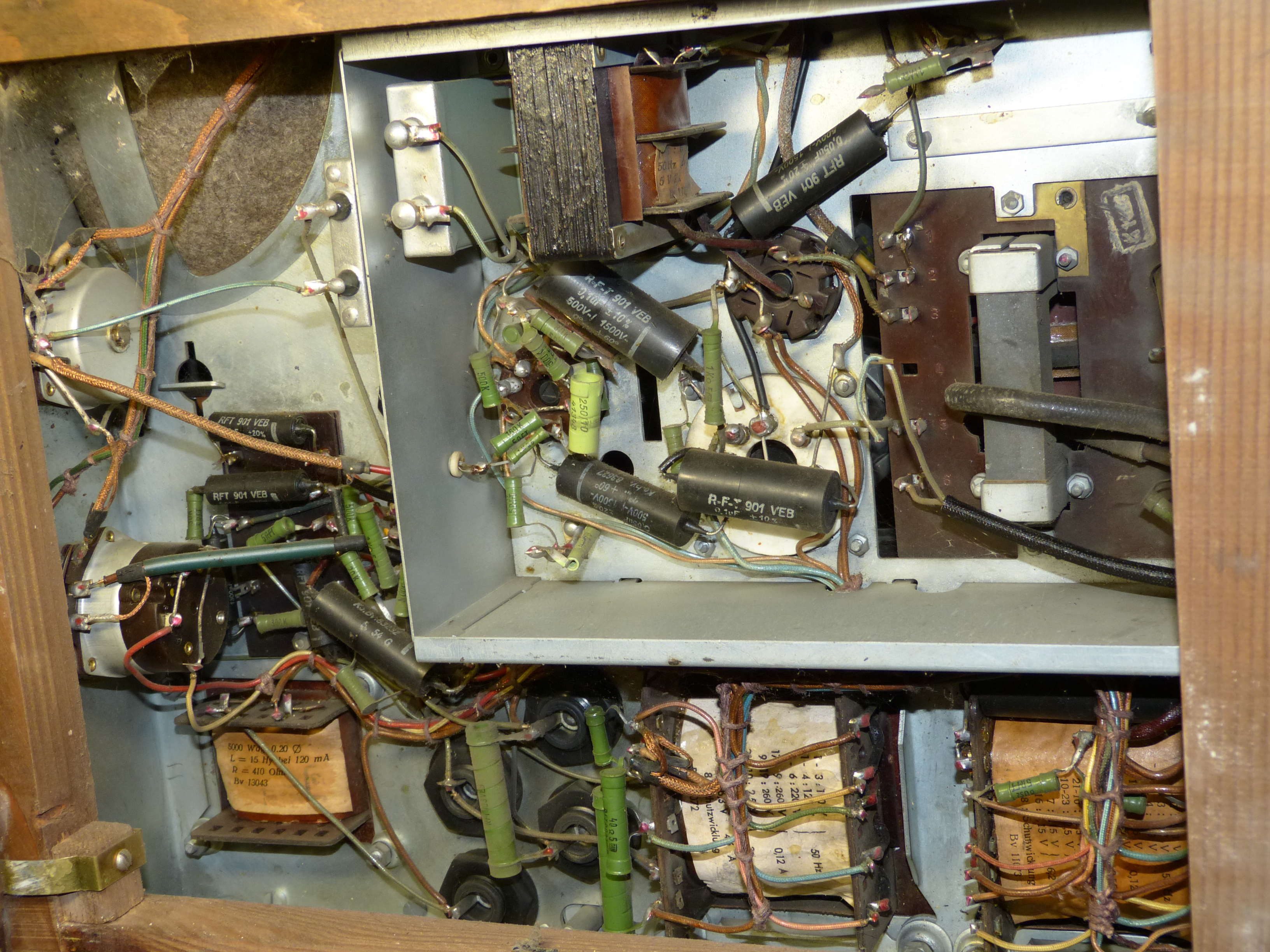 Es handelt sicht um das "D"-Modell. Nach dem Öffnen und grobem Entstauben sah die ganze Elektronik unverbastelt aus, auf den ersten Blick zumindest. Es ist noch der originale Tuner und eine 1Z1 als Hochspanungsdiode. Alle Zettel und Aufkleber sind unbeschädigt und recht gut lesbar.