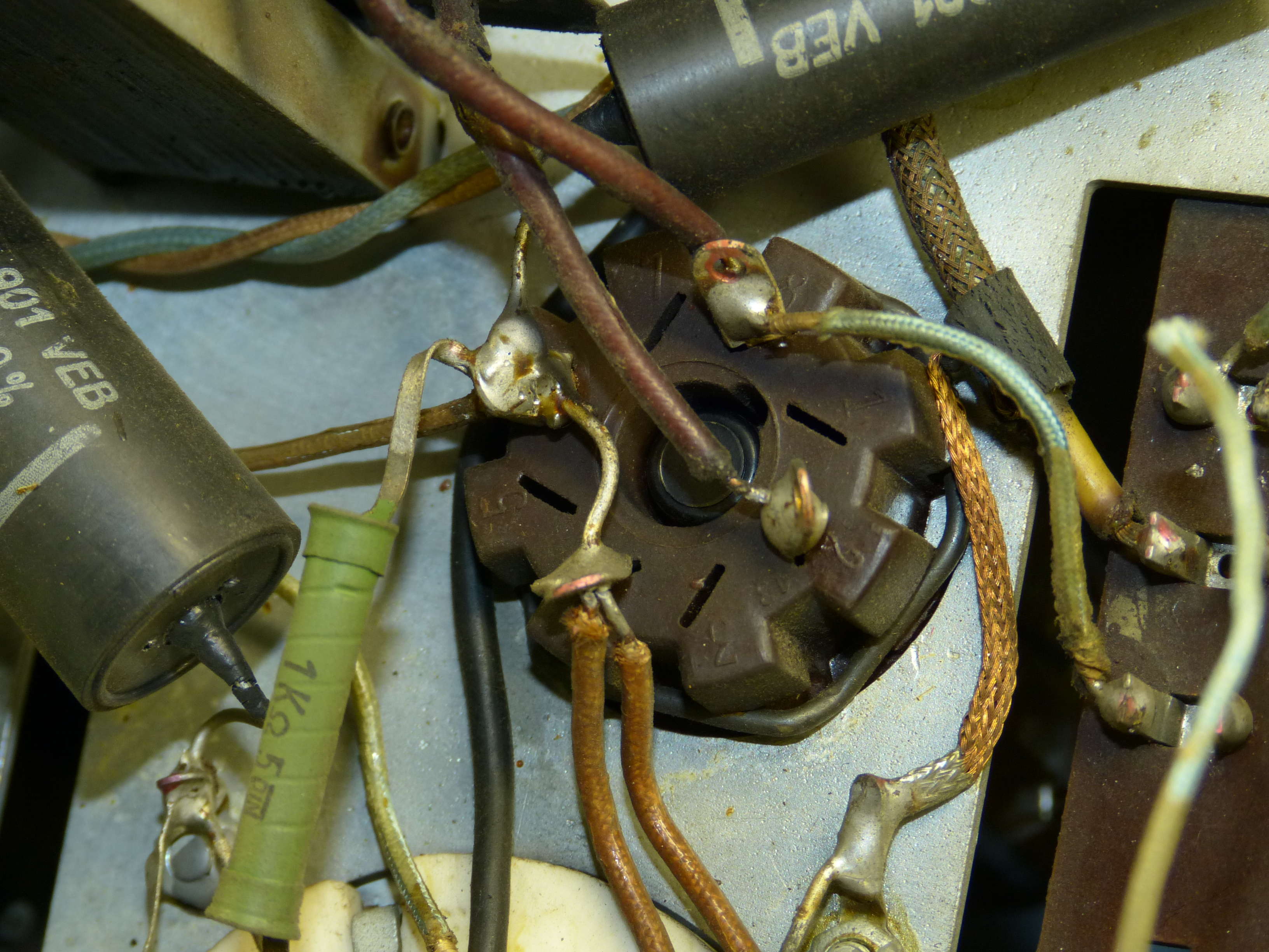 1. der abgebrochene Draht wurde offenbar von jemand angefasst und zurückgebogen - warum? 2. der Kondensator C88 führt vom Stift 1 zu den Anoden der Röhre 19, und nicht nach Masse wie auf dem Schaltplan. 3. das RC-Glied C89/W111 in der Hochspannungsleitung an der 1Z1 fehlt