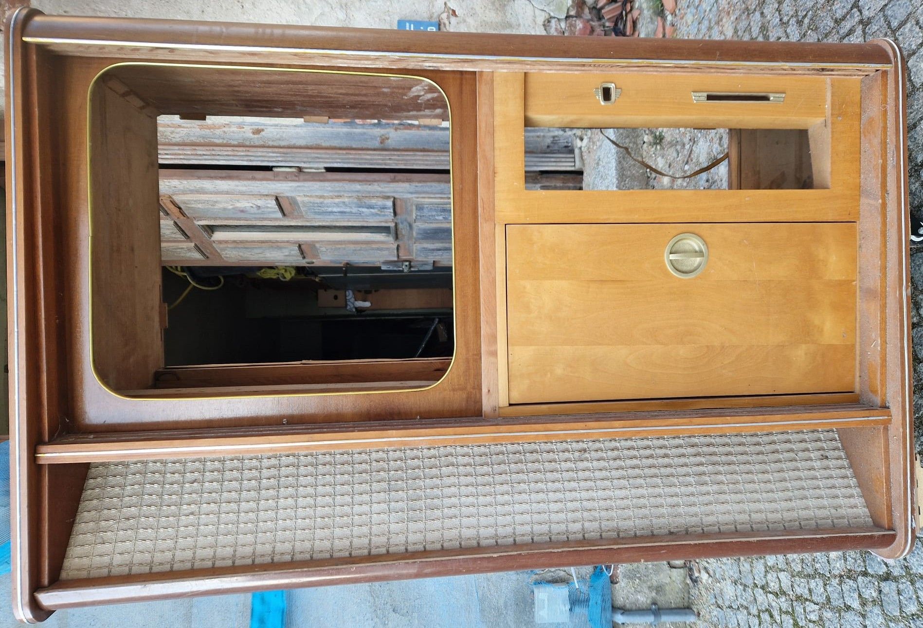 Was könnte in dem leeren Ausschnitt gewesen sein. Ich kenne keinen Fernseher ohne zusätzliche Bedienfront. Welcher Plattenspieler passt auf das ausziehbare Brett?