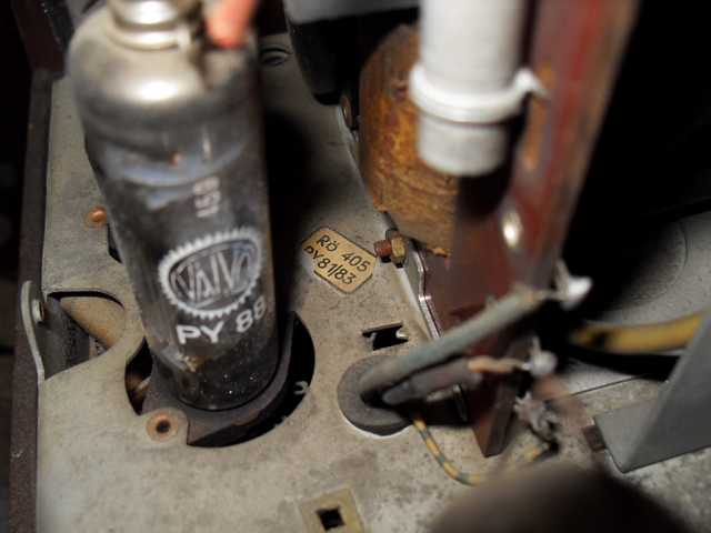 Die Fassung der DY selbst sieht original aus,ist mit dem Blech original vernietet.Aber das Blech darunter,an der die Fassung und der Zeilentrafo befestigt ist,ist wohl relativ leicht austauschbar.Hab ich gesehen anhand der Schrauben.Könnte sein das vielleicht mal das alles komplett getauscht wurde..?Jedenfalls sehen manche Lötstellen von gewissen Drähten dort so aus. Da ist übrigends noch so ein "geheimnissvoller" runder Wahlschalter mit Schlitz der mir ein Rätsel ist(auf dem einen Foto links neben der PL36).Sieht aus wie ein Schalter um die Netzspannung zu verstellen,aber ohne jeglichen Aufdruck.