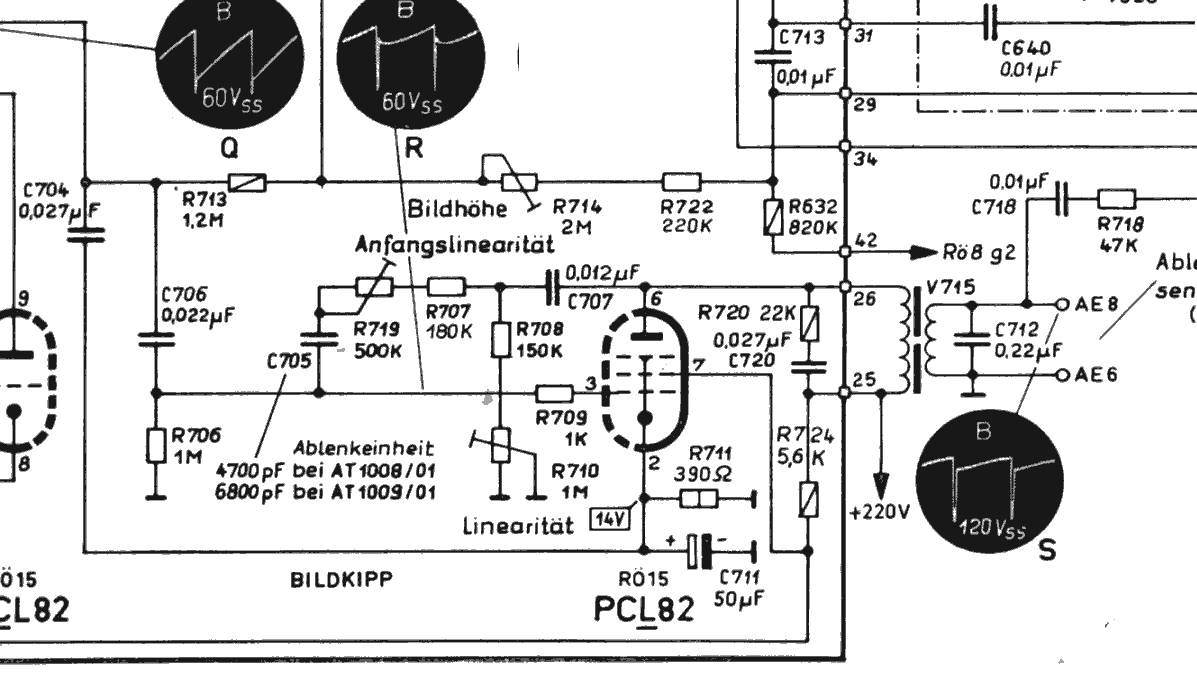 Wie Rainer bereits geschrieben hat, ist eine PCL82 für dle Vertikalablenkung eingebaut. Ich empfehle Dir, sämtliche Kondensatoren in dieser Stufe zu ersetzen. Schlechte Isolationswiderstände führen zu diesem Fehler.