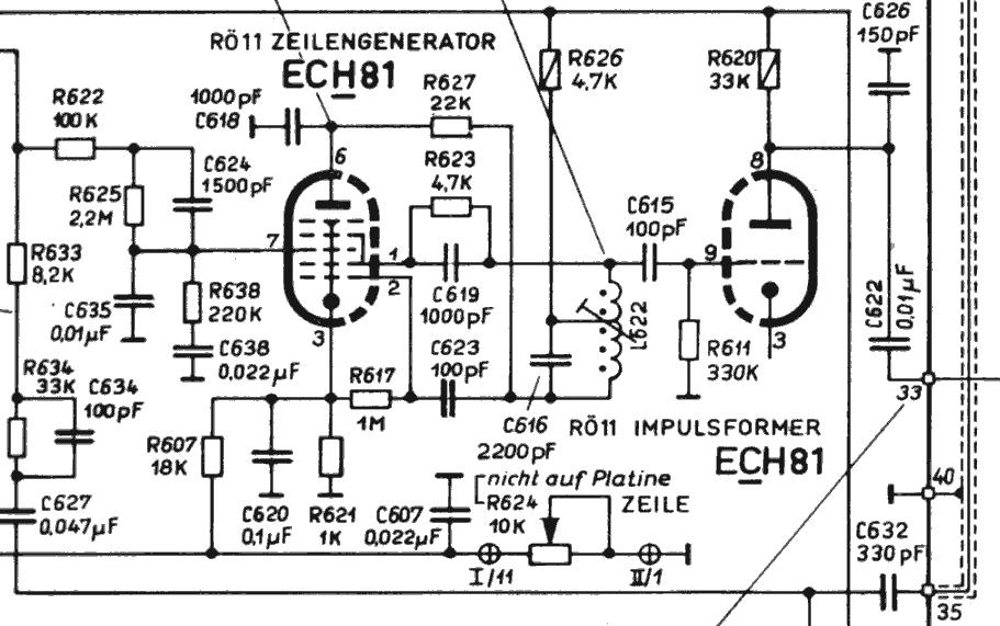 Hier liegt ein Fehler im Zeilengenerator vor. Ist die Röhre ECH81 in Ordnung? Wie reagiert der Regler "Zeilenfrequenz" nach dem Einschalten und im Fehlerfall? In dieser Stufe sind einige hochwertige Kondensatoren eingebaut, die kaum ausfallen. Schwarze Bonbons aber ersetzen.