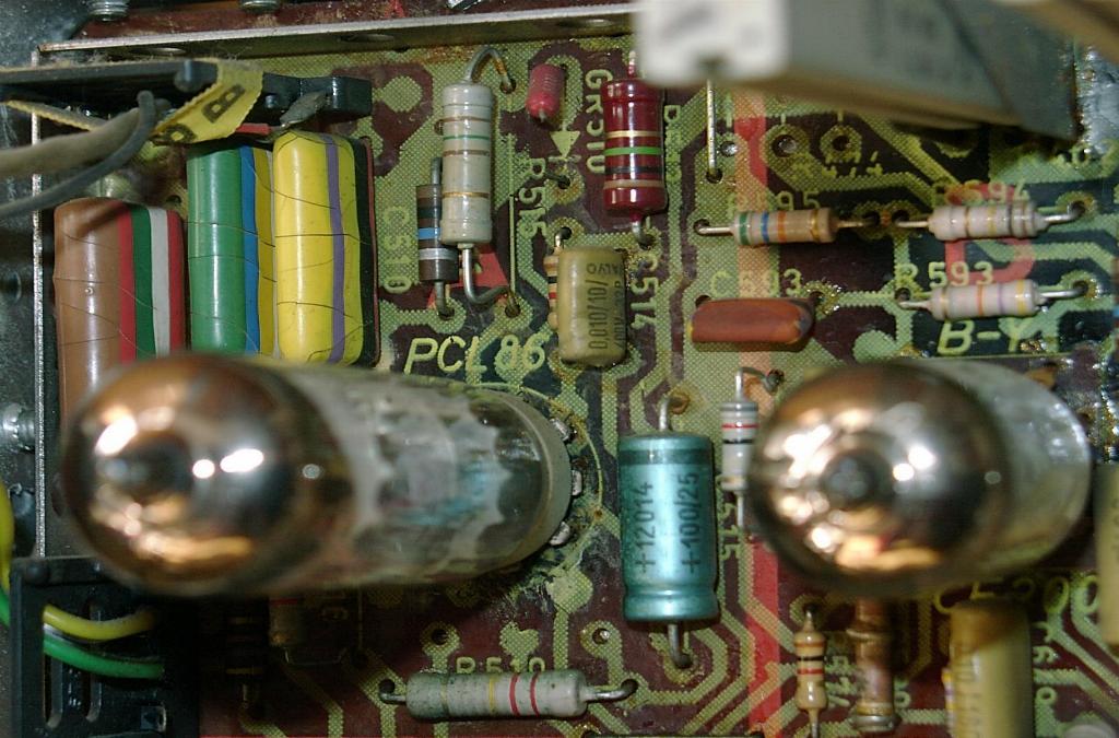 Die Platinen rund um die Röhren habe ich mir genau angeschaut. Sie sehen noch erstaunlich gut aus und sind nicht verkokelt. Ich habe den K8D gestern immer nur kurz (bis gerade das Bild kam) eingeschaltet, weil ich nicht wusste, ob die Elkos nach den vielen Jahren deformiert sind und somit heiß werden. Daß ich die gerissenen Kondensatoren drin lassen kann ist schon mal ein guter Hinweis, so spare ich mir den Aufwand des Auswechselns. Die Tatsache, dass der Fernseher plötzlich wieder ein Bild hat, bedeutet doch, dass es sich vor ca. 10 Jahren um einen Wackelkontakt oder eine kalte Lötstelle handeln musste, als plötzlich direkt nach dem Einschalten der Ton sehr viel lauter und das Bild nur noch Streifen hatte. Obwohl mich eins wundert: Der Ton ist immer noch sehr viel lauter, als ursprünglich. Der Lautstärkeregler stand sonst immer in der Mitte für Zimmerlautstärke. Jetzt steht er bei gleicher Lautstärke fast ganz auf Minimum, also fast links am Anschlag. Vielleicht bekommt der Tonteil zu viel Spannung? Vielleicht ist aber auch nur eine Röhre defekt. Sie glühen zwar fast alle (bis auf die GY501), aber ob sie trotzdem in Ordnung sind, weiß ich natürlich nicht. Die GY 501 beispielsweise glüht nicht, aber sie steckt ja auch in einem Gehäuse und vielleicht sieht man das Glühen deshalb nicht. Einen Reserveröhrensatz sollte ich mir vielleicht zulegen, obwohl ich den Fernseher (wenn er überholt ist) nur noch selten für besondere Anlässe und dann auch nur für maximal eine halbe Stunde einschalten werde, aber je länger man wartet, desto seltener und teurer werden die Ersatzröhren.