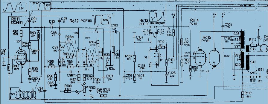 Also die Steuerstufe (Zeilenoszillator) treibt die Zeilenendsröhre mit einem Zeilenimpuls. Oft ist der Koppelkondensator zwischen diesen beiden Stufen durchgeschlagen. Welchen Wert dieser Kondensator hat, kann ich nicht sagen, da hier das Schaltbild derzeit nicht vorliegt.