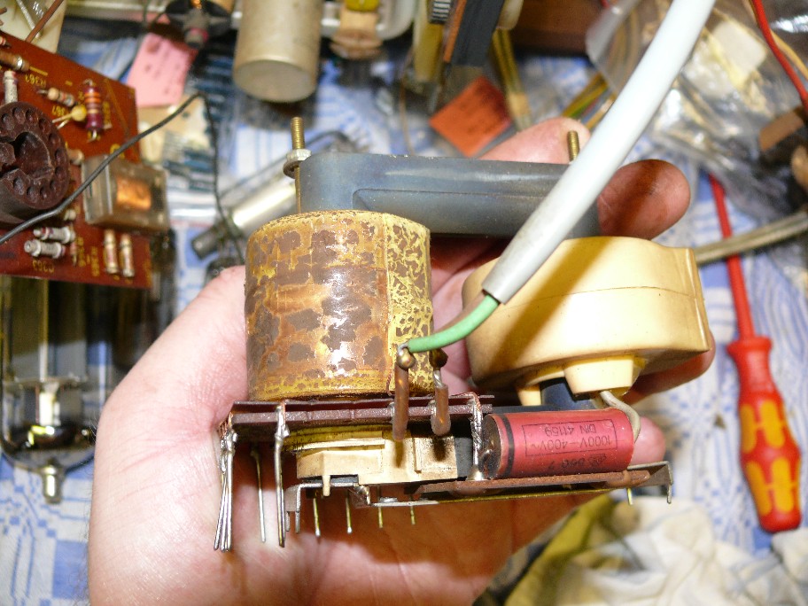 diese Trafos sollte man wenn sie schon längere Zeit unbenutzt gelegen haben niemals ohne Vorbehandlung in Betrieb nehmen, in der Regel gehen die dann innerhalb der ersten 5 bis 10 Minuten kaputt. Das betrifft speziell Zeilentrafos in dieser Bauweise von Philips mit der gerissenen Vergußmasse. Nachbauten dieser Trafos, z. B. von König mit Wickelfolien, sind da unempfindlich und sehr haltbar. Der Trafo müßte gründlich getrocknet werden, ca. 1 Tag bei 50 - 60°C lagern, und anschließend mit Plastik 70 von Kontaktchemie tränken und konservieren.