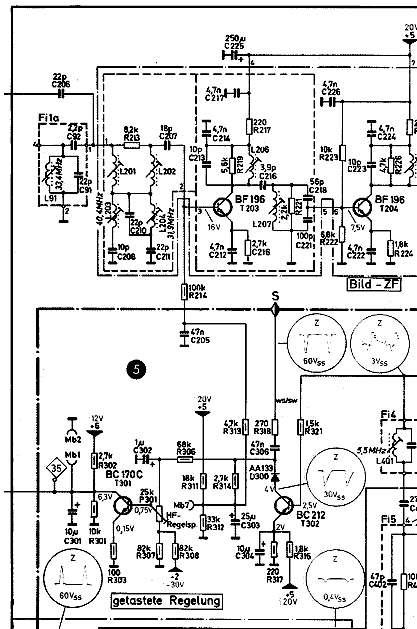 Über den Widerstand R321 kommt das FBAS- Signal an die Taststufe. Das zweite Signal ist der negative Rückschlagimpuls 60Vss vom Zeilentrafo, Den Widerstand R214 abzulöten ist nicht sinnvoll. Damit fehlt an der ersten Stufe der Bild- ZF die Basisspannung und es kommt kein Signal mehr. Den Wert des eingebauten Widerstandes R214 nehmen wir hin, da das Gerät damit funktioniert hat. Hier kann die Angabe im Schaltplan falsch sein. 100 kOhm erscheinen mir zu hoch. Wie hoch sind die Spannungen am Emitter, am Kollektor und an der Basis der Transistoren T302 und T301?