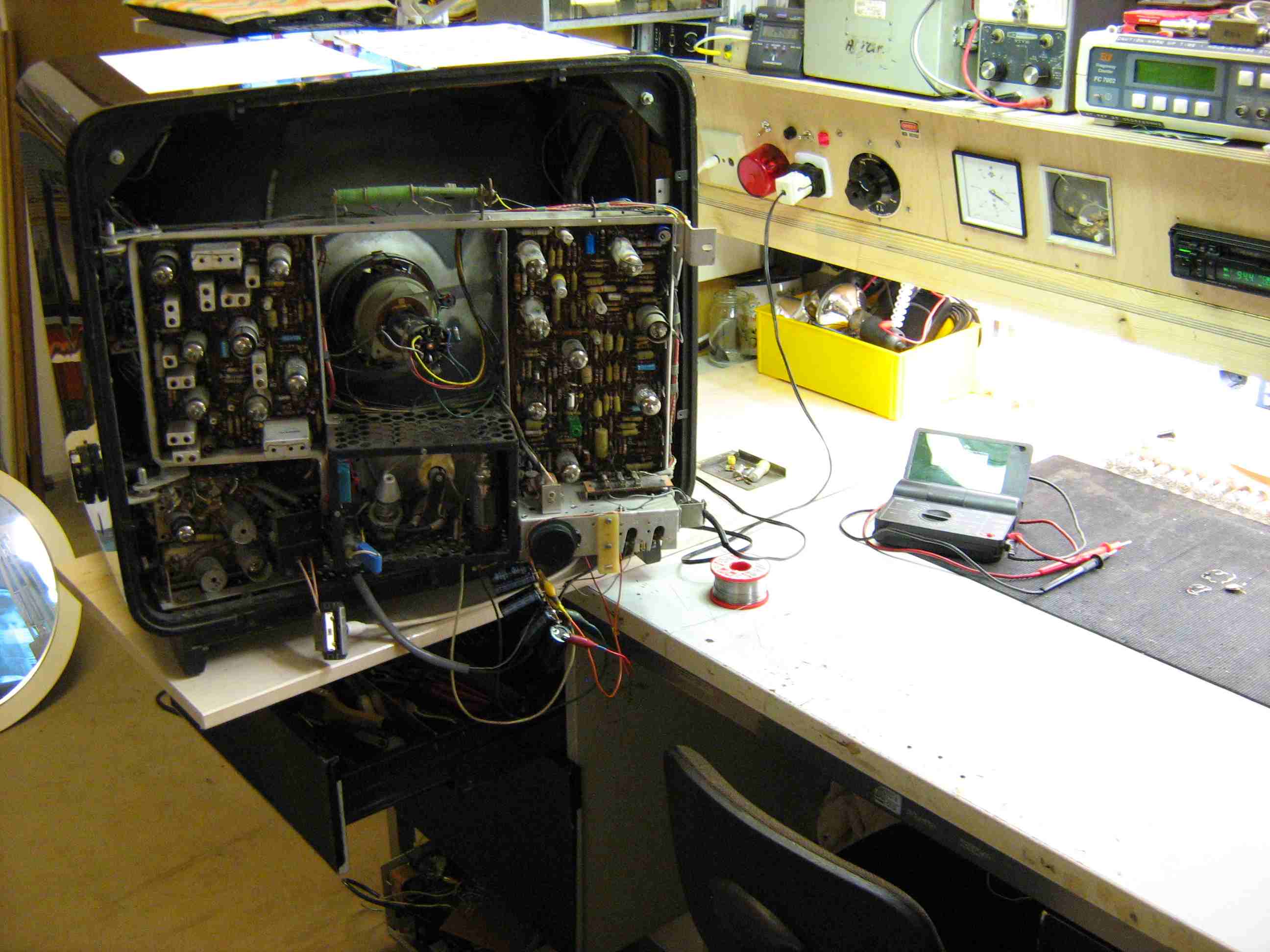 Nach einer Stunde war die Nachrüstung fertig und funktioniert prima. Der Antennenausgang des Modulators endet in einer "richtigen" Antennensteckdose direkt neben dem Stelltrafo, der Antenneneingang wurde per Koaxleitung aus der Verteileranlage heraus zum Prüfgeräte-Regal geführt und dort an einen Philips-Bildmustergenerator PM5508 angeschlossen. Dieser stellt zusätzlich ein Signal im VHF-Bereich zur Verfügung.