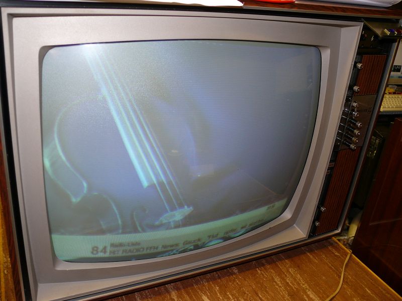 Das Bild ist sehr schmal, matschig und dunkel. Stromaufnahme im Betrieb bei ca. 230Volt ca. 1,2 - 1,5A. Die Sendereinstellung sitzt auch fest. Meßdaten der Bildröhre: Rot: 0,5mA, Grün: 0,55mA, Blau: 0,65mA Trotz der Meßwerte ist das Bild grünstichig. Rot fehlt eigentlich. Auf die Potis für den Weißabgleich, Helligkeit, Kontrast, Farbe etc. reagiert das Gerät.