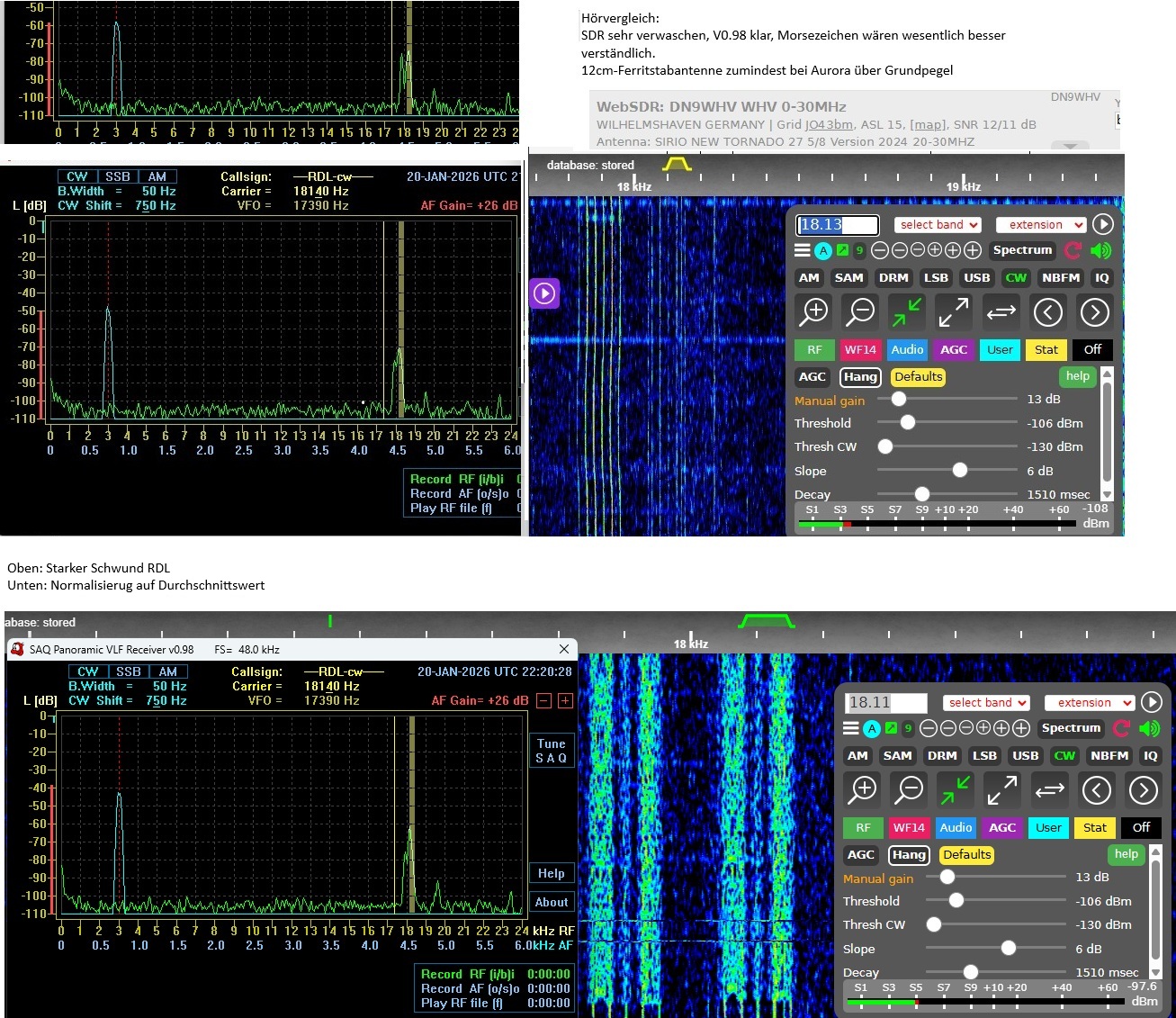 Auch das 50kM entfernte Kiwi-Web-SDR zeigte diese Schwankungen. Die beiden RDL- Transmitter auf 19,940 und 18,140 wurden auch unterschiedlich stark gedämpft, wie das obere Bild zeigt.