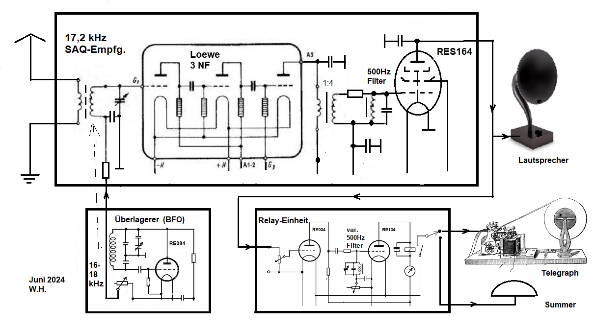 Da aber die Aussendungen von SAQ in CW geschehen, ist zur Hörbarmachung derselben ein Fremdüberlagerer erforderlich, welcher entweder 500Hz oberhalb, oder 500Hz unterhalb von 17,2 kHz abzustimmen ist! Als getrennte Einheit mit einstufigem Oszillator RE084 wird die erzeugte Frequenz, genau dosiert, auf die Gitterspule induktiv(!) eingekoppelt. Zur Information, die riesigen Spulen haben ein rel. großes Streufeld!