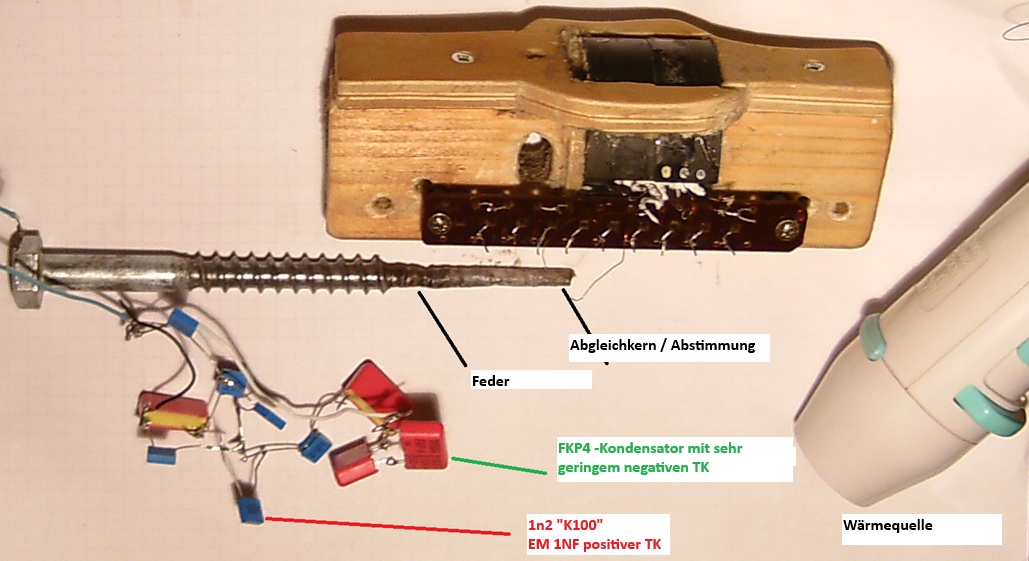 Der Ferritkern wurde auf Temperatur gehalten, dann die "roten" FKP-Kondensatoren unter annähernder Beibehaltung der Frequenz durch die "blauen" ersetzt, bis ein Frequenzabfall bei Erwärmung auch von etwa 60 Hz stattfand.