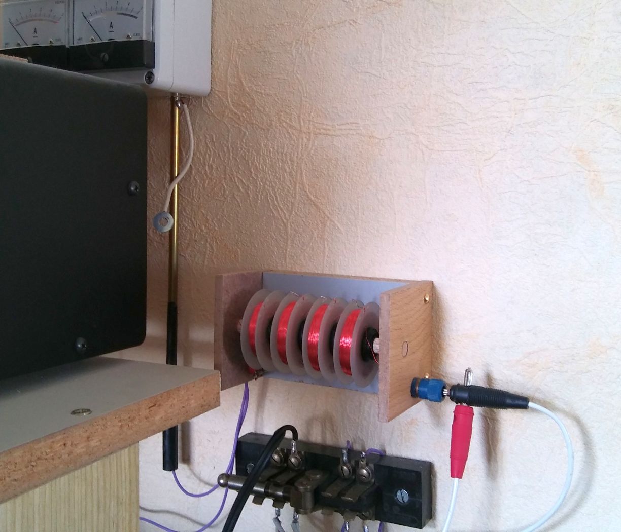 Etwas genervt ging ich zum Plan B über, wahrscheinlich ohnehin die beste Lösung. Die Aussenantenne 2x18m über 7m Feeder sollte auf 17,2 kHz angepasst werden. Dazu musste die Dachkapazität von etwas über 400pF in Resonanz gebracht werden. Rechnerisch kam ich auf 202 mH, die ich aus der Reihenschaltung von 4 Rollen Kupferlackdraht 0,2mm realisiert habe. Das funktioniert richtig gut, wie ich aus dem Empfang der Nachbarstationen, dem Antennenrauschen und den dauernden Knacksern der Funkenabrisse entnehme. Die nutzbare Bandbreite beschränkt sich aber auf etwa nur 5 kHz.