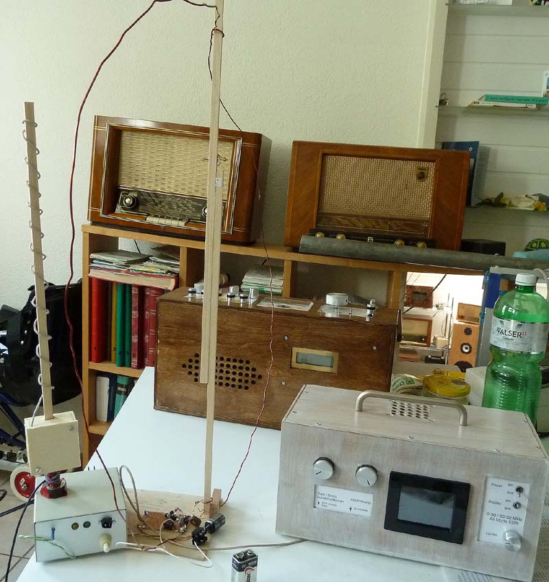 Links die Aktivantenne (mit dem gewendelten Draht), daneben die magnetische Loop (ebenfalls aktiv), weiter rechts das Software Defined Radio und dahinter das analoge Spitzensuper. Die beiden Philips im Hintergrund konnten leider nichts beitragen...