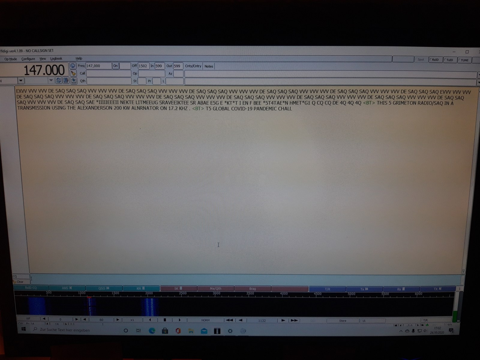 SAQ konnte ich heute mit leichten Startproblemen gut empfangen. Zuerst ging die MiniWhip nicht (schiet billige BNC...) dann die Accus vom PL660 und MP3-Player fast leer. fldigi war auf die Schnelle auch nicht bereit das Tonsignal auf die PC-Lautsprecher auszugeben, decodieren hat allerdings geklappt, der Ton kam dann halt live via Kopfhöhrerausgeng vom MP3-Player.