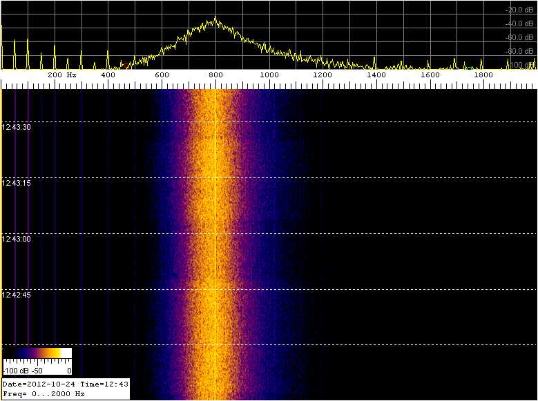 Theoretisch ginge es noch etwas schmalbandiger bei einer Punktlänge von ca. 100msec. Die Frequenzstabilität von SAQ macht mir aber - zumindest in der letzten Zeit - einen Strich durch die Rechnung. Ich habe hier eine Drift von 30..40Hz innerhalb von Minuten festgestellt. siehe Spektrogramm. Das ist nicht dramatisch. Wer bei üblicher CW-Bandbreite nur auf die Morsezeichen hört, wird es kaum bemerken. Wer aber mit geringstmöglicher Bandbreite arbeiten will (oder muß), müßte öfter nachstimmen. Das gilt übrigens auch, wenn man die Bandbreite bei üblichen Empfängern erst nachträglich NF-seitig einengt.
